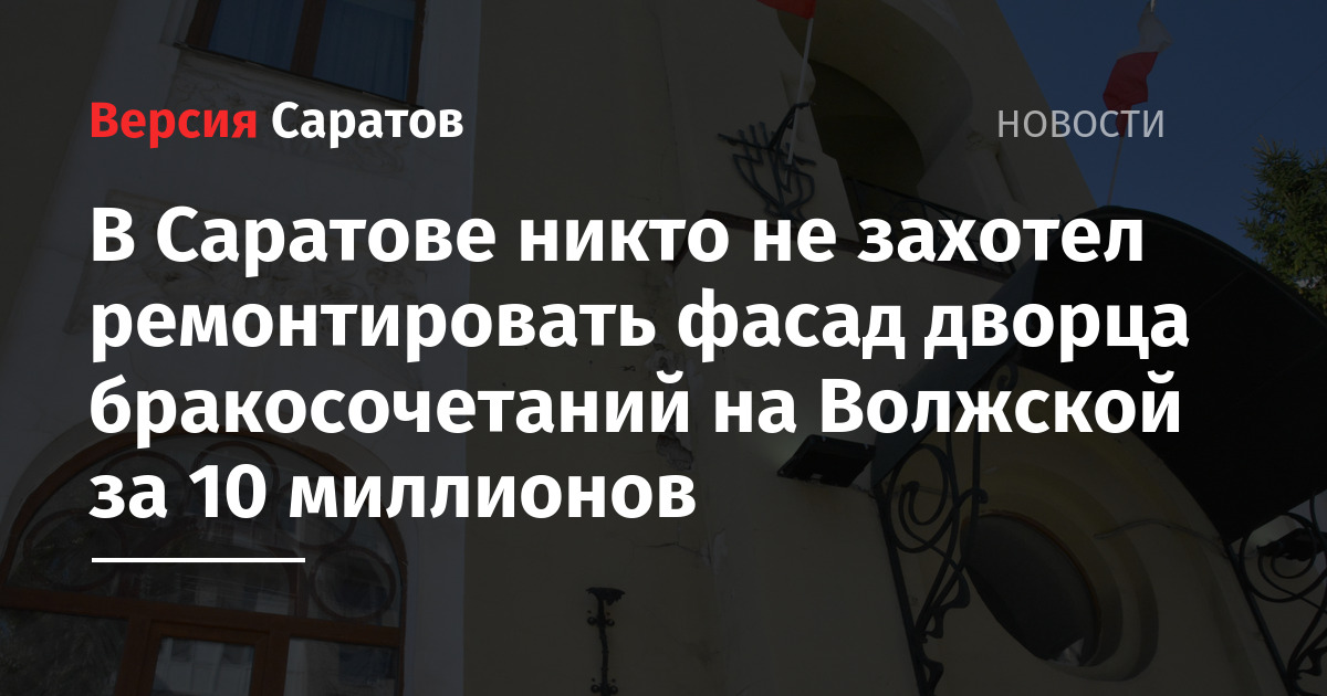 Управление по делам ЗАГС правительства Саратовской области не смогло найти желающих отремонтировать фасад дворца бракосочетаний на улице Волжская. Об этом сообщила начальник управления Юлия Пономарева в ходе заседания комитета по бюджету, налогам и собственности Саратовской областной думы.