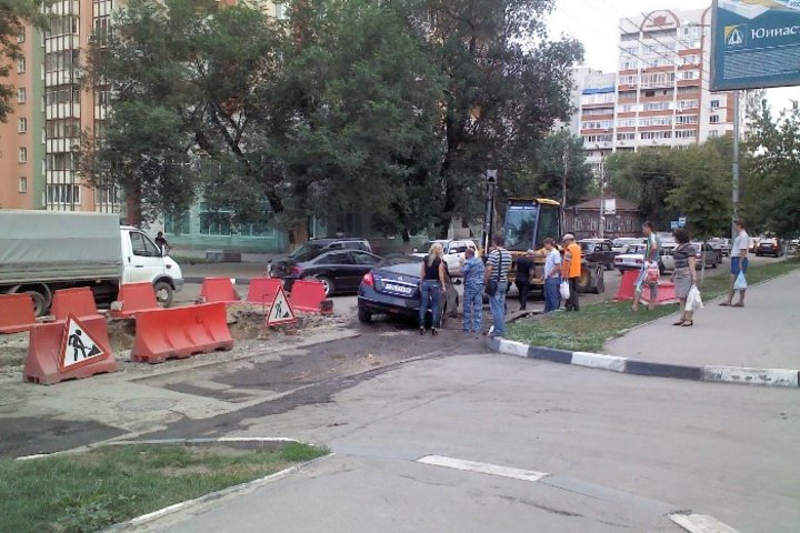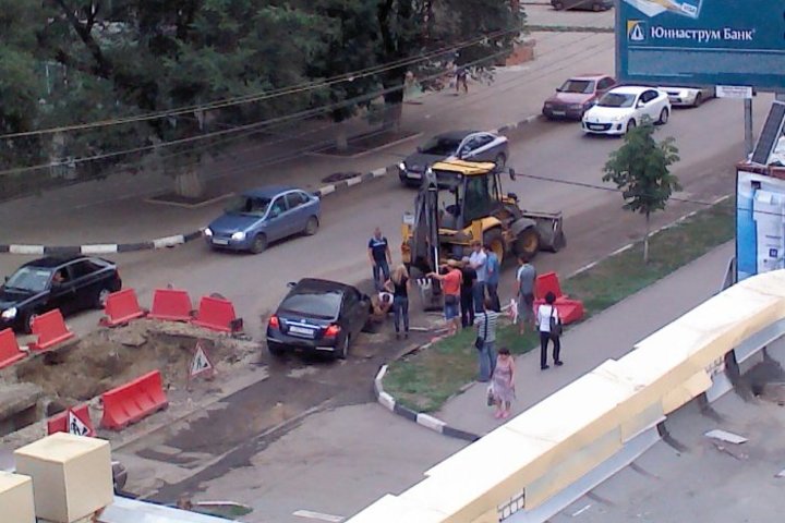 В Саратове на пересечении улиц Чапаева и Большой горной Nissan провалился в котлован, который вырыли рабочие, ремонтирующие дорогу. Сейчас автомобиль пытаются достать из ямы. На месте происшествия собралась толпа зевак.