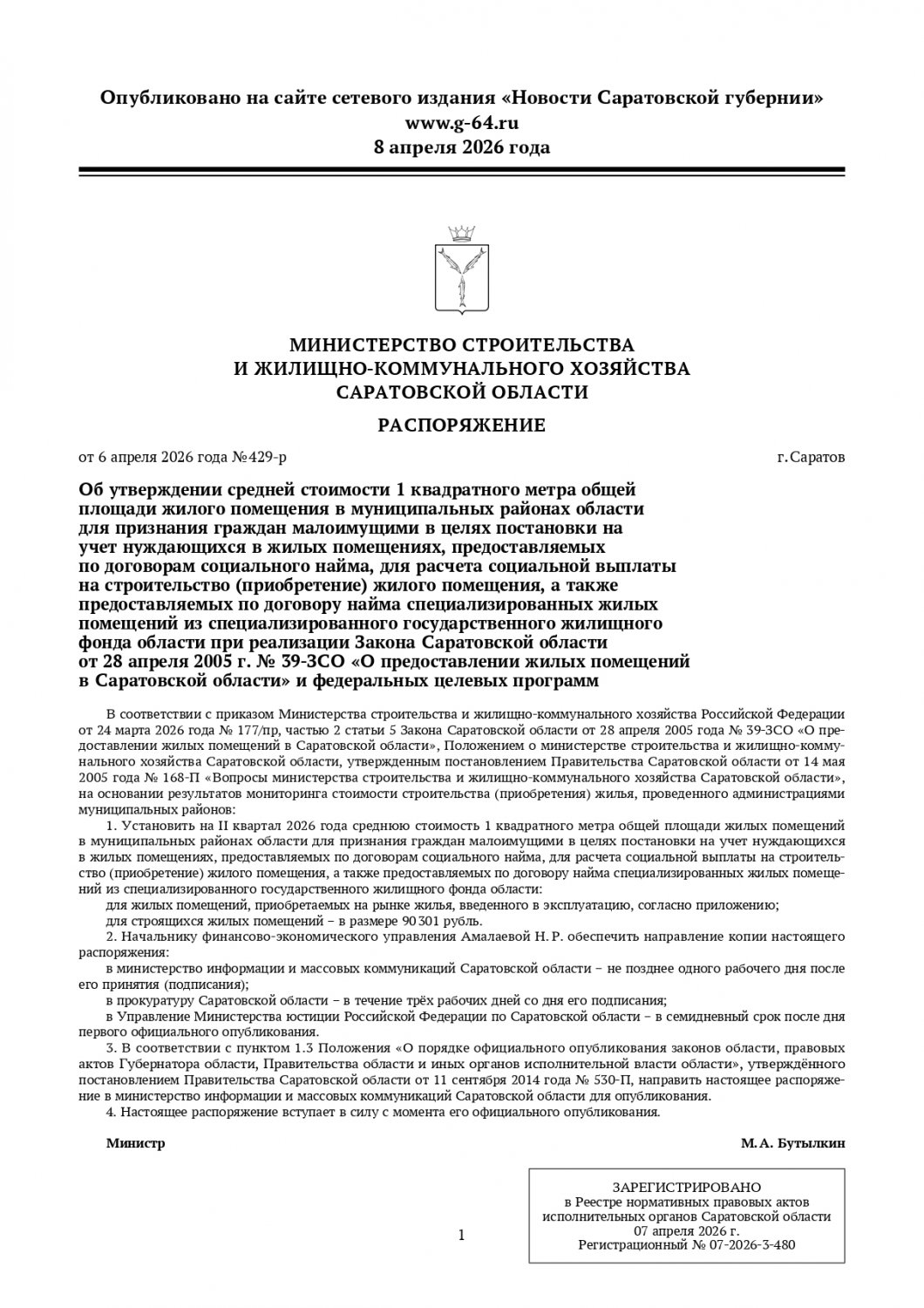 В Саратовской области утверждены нормативы стоимости квадратного метра жилья на второй квартал 2026 года. Показатель власти используют при расчете социальной выплаты на строительство или приобретение жилья. Приказ подписал министр строительства и ЖКХ региона Михаил Бутылкин.
