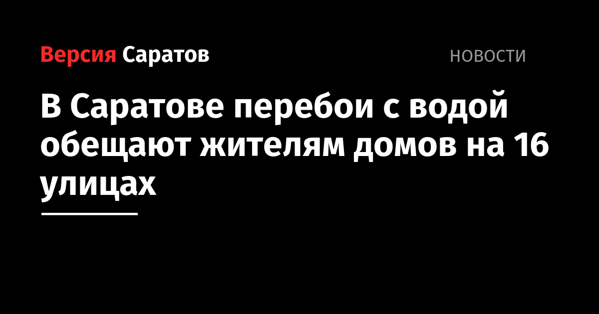В Саратове без воды могут остаться жители домов на 16 улицах. Для ремонта городского водопровода сегодня до 18:00 напор воды снизили жителям домов № 97 — 199 на улице Танкистов. Кроме того, перебои с водой могут возникнуть в домах на улицах Плодородной, Просечной, Окольной, Природной, Ударной, Трудовой. Без воды могут остаться собственники жилья на Минеральной, Агрономической, Раздольной, Юбилейной, Приусадебной, Отрадной, Участковой. Отключение также коснется владельцев домов на 1-м и 2-м Ангарских проездах.