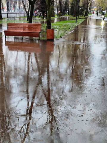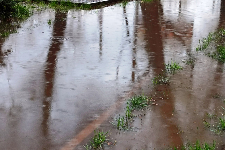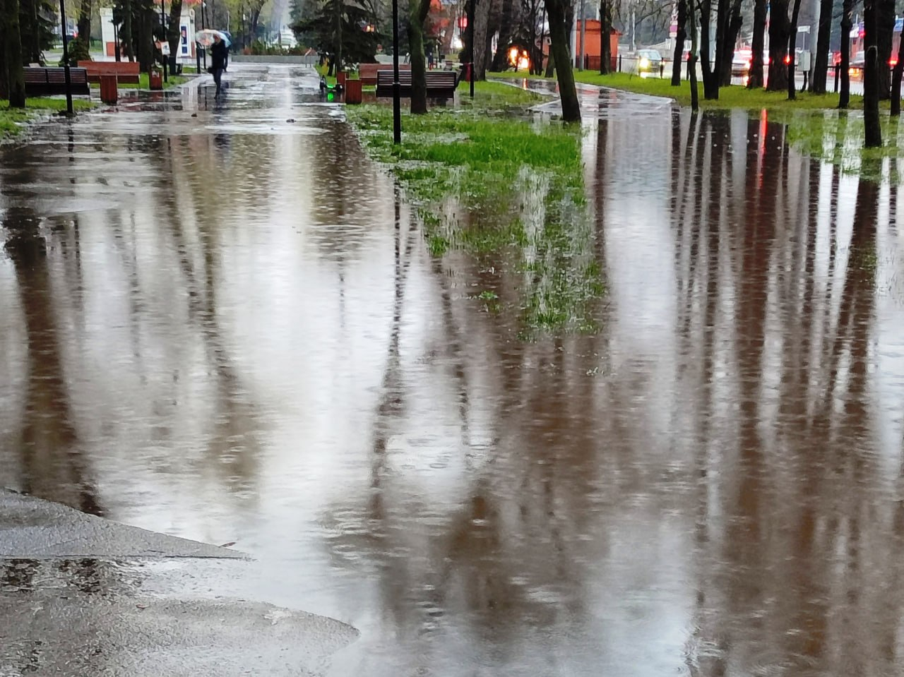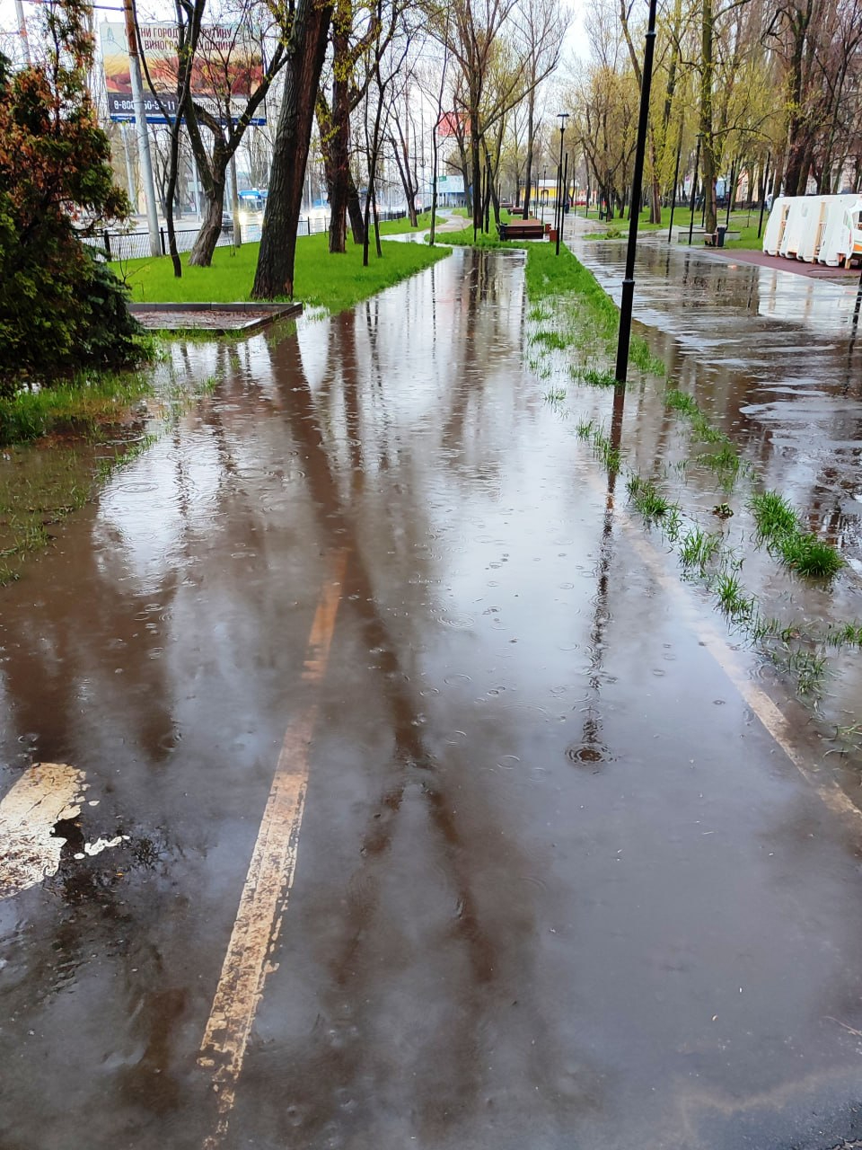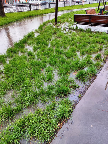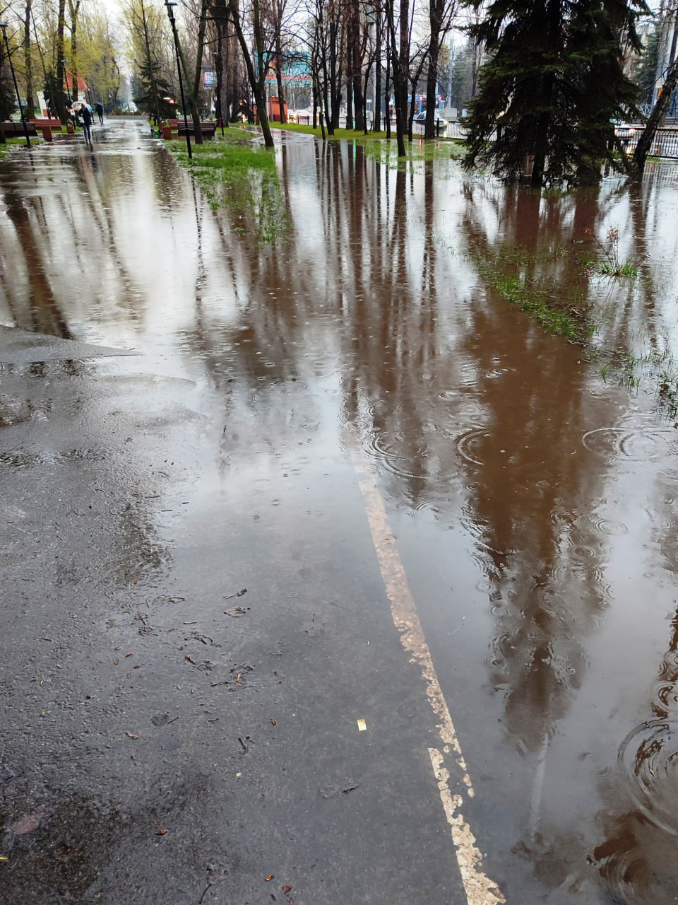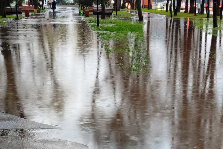 Ливнёвки не справляются по всему городу. Пешеходные переходы через автодороги повсеместно непроходимы без резиновых сапог и матерных слов», — высказался горожанин, прикрепив фотографии залитого сквера.