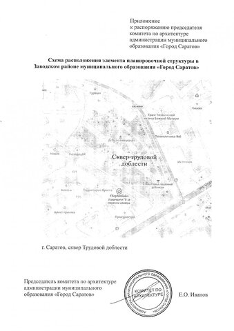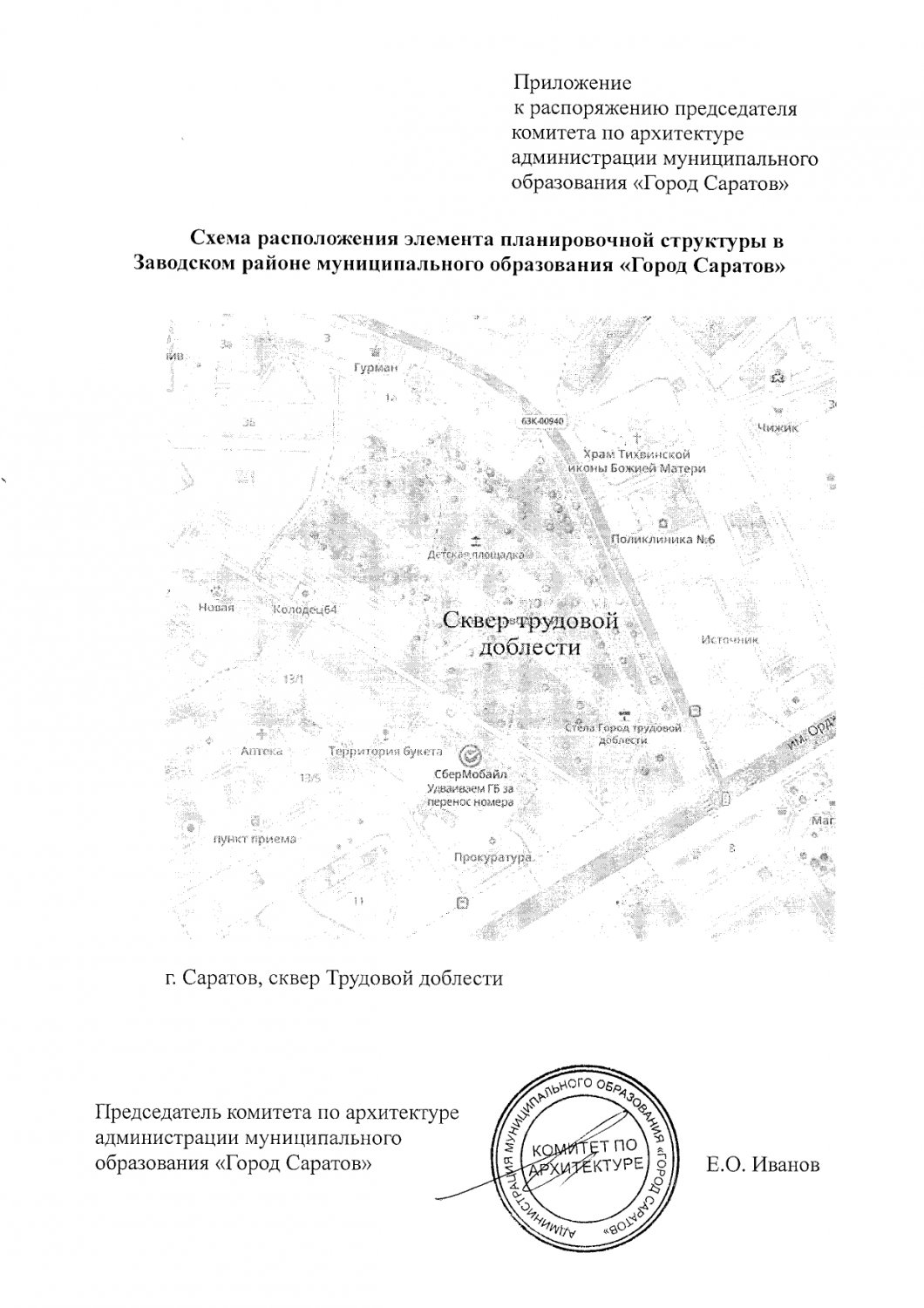 «Присвоить наименование элементу планировочной структуры Заводском районе муниципального образования „Город Саратов“ — скверу, ограниченному с северо-востока проспектом Энтузиастов, с юго-востока улицей Орджоникидзе, с юго-запада и северо-запада жилой застройкой, — Российская Федерация, Саратовская область, городской округ город Саратов, сквер Трудовой доблести», — отмечается в документе.
