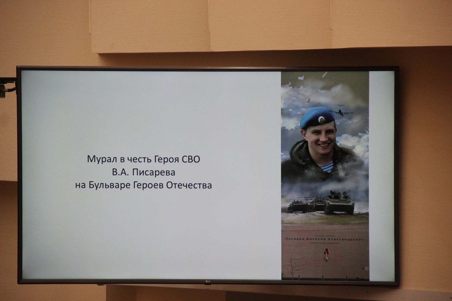 Мурал посвящён гвардии сержанту ВДВ Виталию Писареву. Он дважды участвовал в Параде Победы на Красной площади в Москве и погиб в марте 2022 года в Киевской области. Автором работы станет Дмитрий Жумаев. Мурал разместят на доме, который расположен по-соседству с домом, на котором изображён погибший вертолётчик Александр Аксёнов.