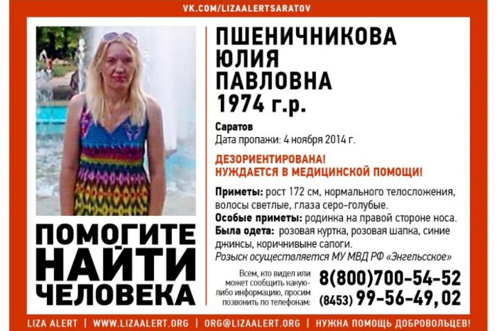 На официальной странице поискового отряда "Лиза Алерт" в социальной сети "ВКонтакте" опубликовано сообщение о пропаже человека. 40-летняя Юлия Пшеничникова потерялась 4 ноября. В сообщении также отмечается, что женщина "дезориентирована и нуждается в медицинской помощи". Приметы: рост 174 сантиметра, нормальное телосложение, светлые волосы, серо-голубые глаза. Была одета в розовые куртку и шапку, синие джинсы и коричневые сапоги. В качестве особой приметы называется родинка на правой стороне носа.