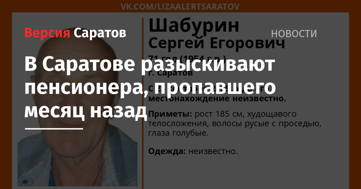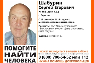 В Саратове разыскивают 71-летнего Сергея Шабурина. Как сообщает поисковый отряд «Лиза Алерт», местонахождение пенсионера неизвестно с 23 сентября. Рост пропавшего — 185 сантиметров. Мужчина худощавого телосложения, волосы русые с проседью, глаза голубые. Во что он был одет, неизвестно.