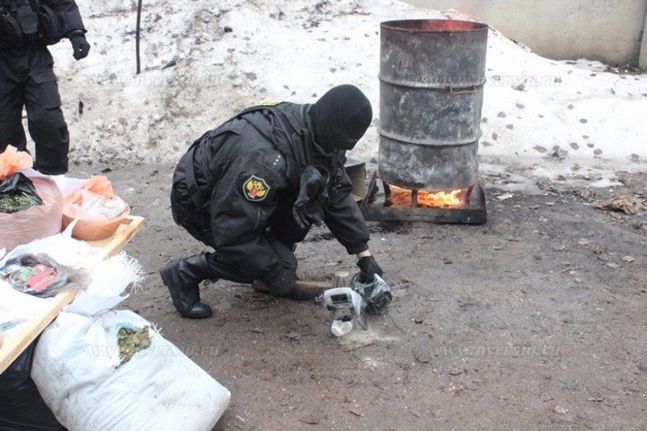 Спецназовцы поместили наркотики в специальную бочку, после чего облили горючей жидкостью и подожгли. В бочку отправились около 17 килограмм наркотических средств, которые являются доказательством по 39 уголовным делам, из них 3,5 килограмма марихуаны попытались привезти с Украины.