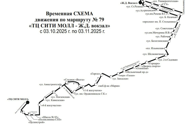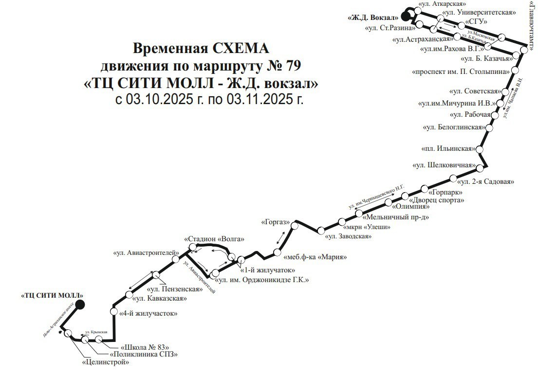 Речь идёт о маршруте № 79. Раньше маршрутки ходили от железнодорожного вокзала до Большого Динамовского проезда. С 3 октября транспорт будет ходить от железнодорожного вокзала до ТЦ «Сити Молл». Таким образом, схема движения сократится. Чиновники отмечают, что изменения временные — до 3 ноября.