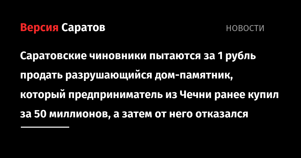 Отметим также, что ранее саратовские власти уже пытались продать этот дом, но безуспешно. Предприниматель Хасан Раилов из Чеченской Республики купил здание за 53,6 миллиона рублей и внес задаток в размере 5,361 миллиона рублей. Однако затем сделка сорвалась и деньги ушли в доход бюджета города. Захочет ли бизнесмен вновь поучаствовать в конкурсе и приобрести здание за 1 рубль — неизвестно.