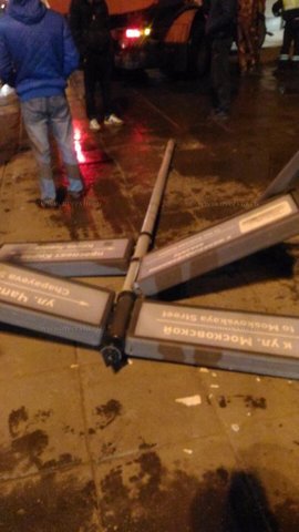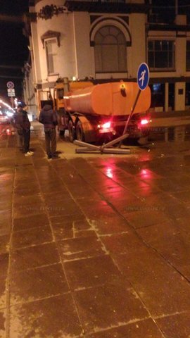 По словам автора публикации, водитель коммунальной техники "заигрался", в шутку пытаясь облить пешеходов. Автомобилист не справился с управлением и не заметил столб, на котором были размещены указатели улиц, установленный на тротуаре.