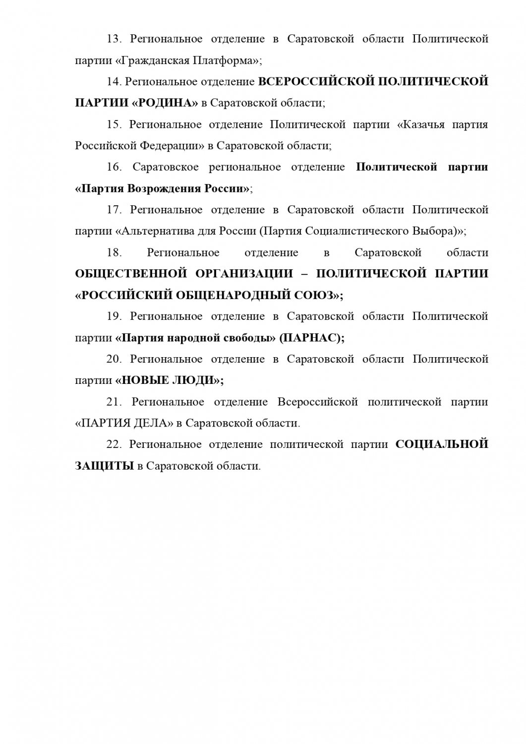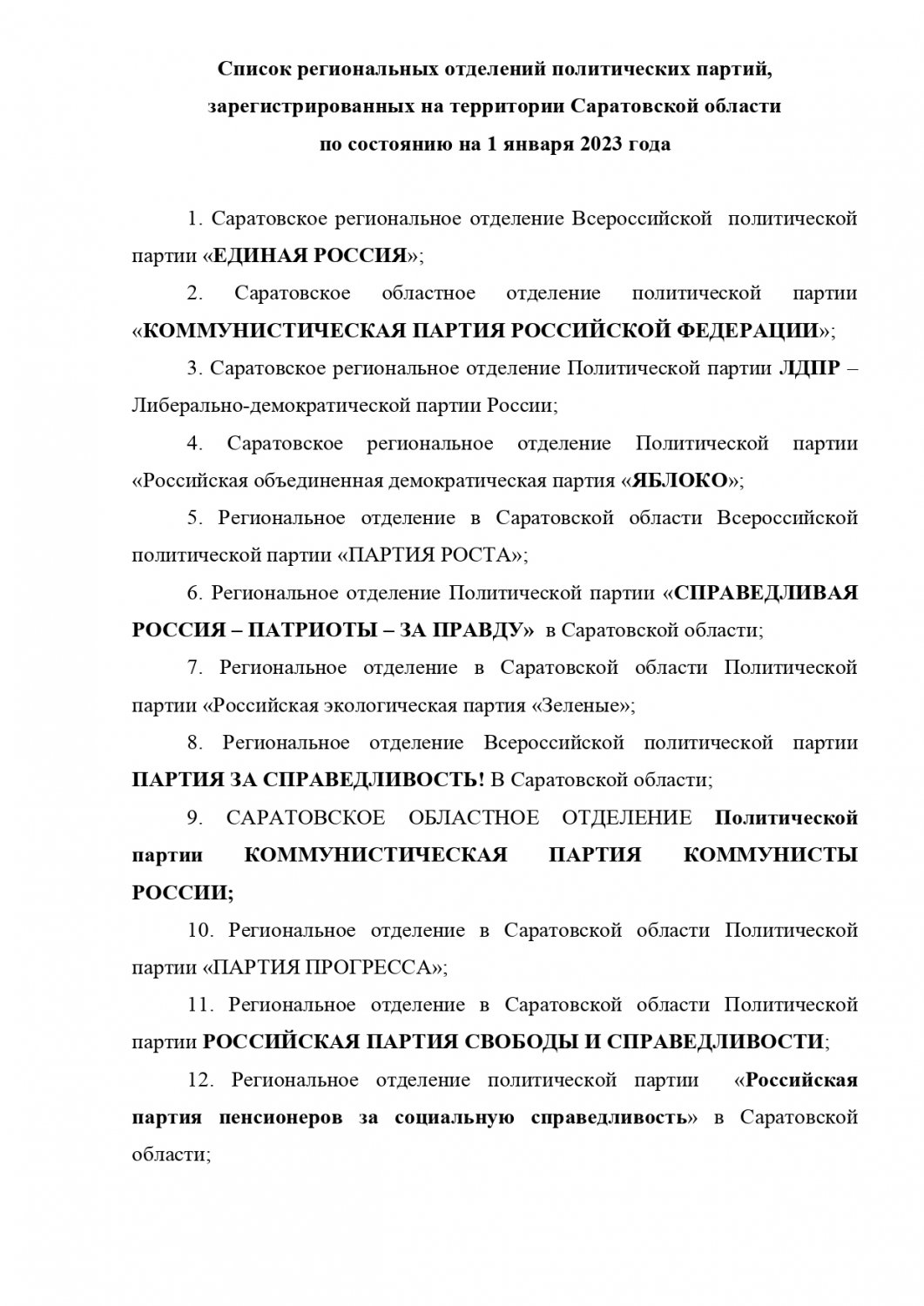 За время с октября 2022 года по январь 2023 года в Саратовской области было ликвидировано региональное отделение политической партии «Патриоты России». Они окончательно влились в партию «Справедливая Россия — Патриоты — За правду». Таким образом, число политических партий в регионе сократилось до минимума за последние 10 лет (со списком оставшихся можно ознакомиться ниже).