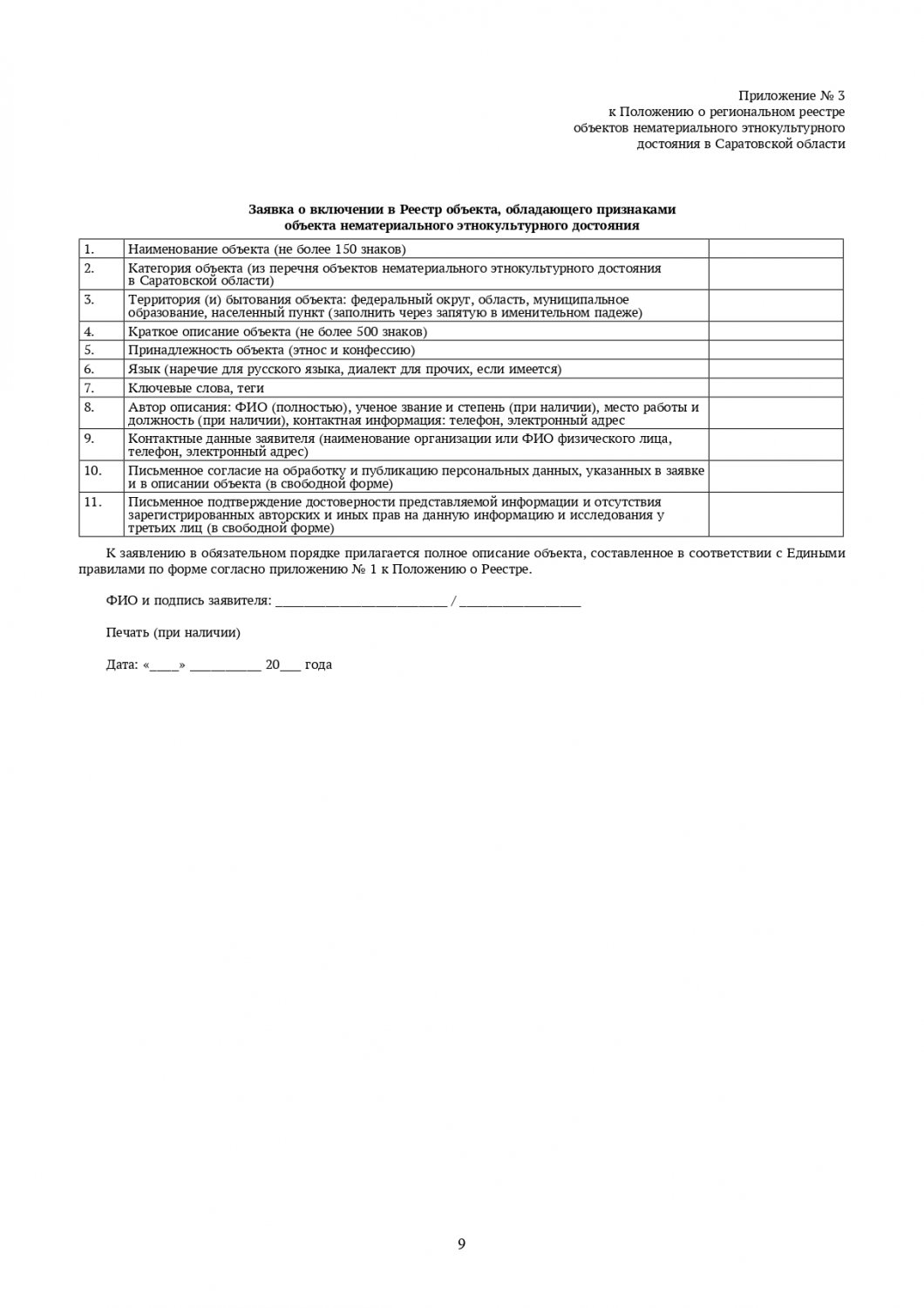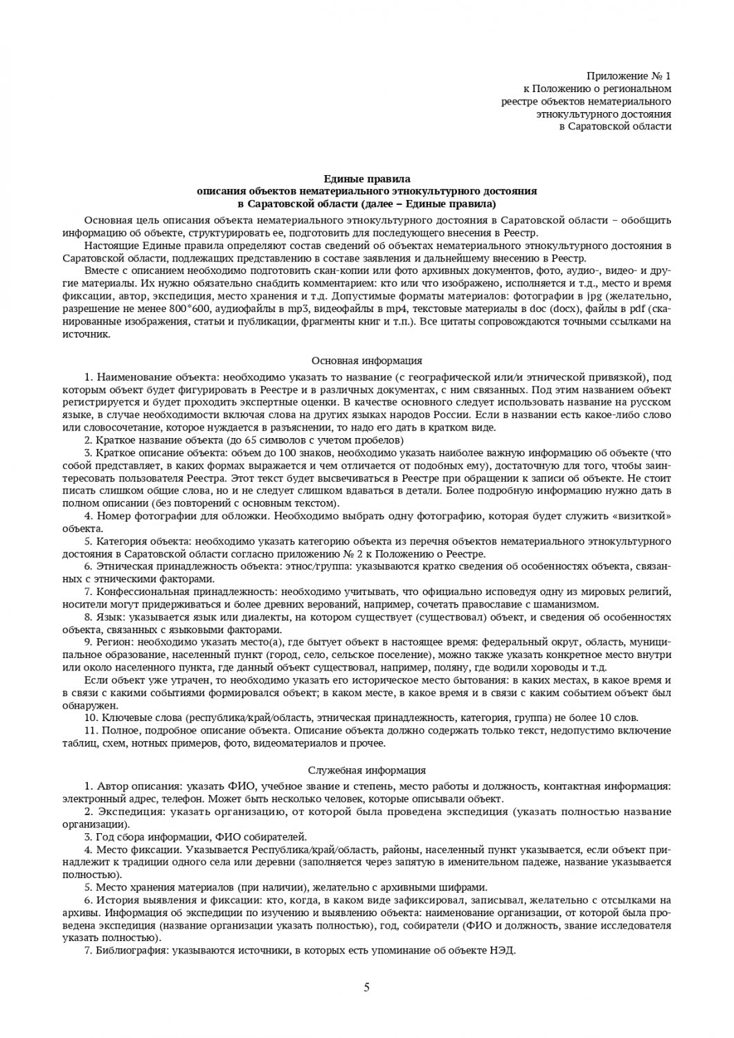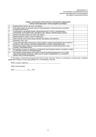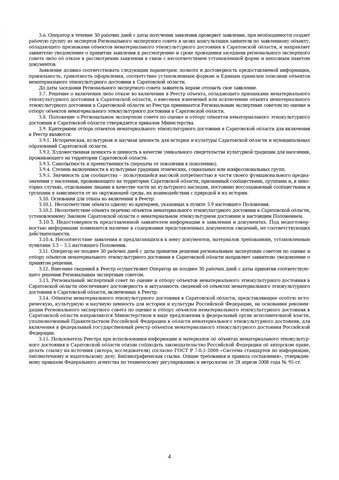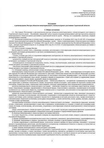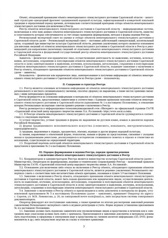 Формирует и следит за реестром объектов нематериального этнокультурного достояния ГАУК «Саратовский областной центр народного творчества имени Л. А. Руслановой». Чтобы решить, стоит ли включать в перечень новый объект, собирается заседание регионального экспертного совета. Критериями для отбора являются историческая, культурная и научная ценность для истории и культуры той или иной традиции, технологии или произведения, художественная ценность, самобытность и преемственность, значимость для того или иного сообщества.