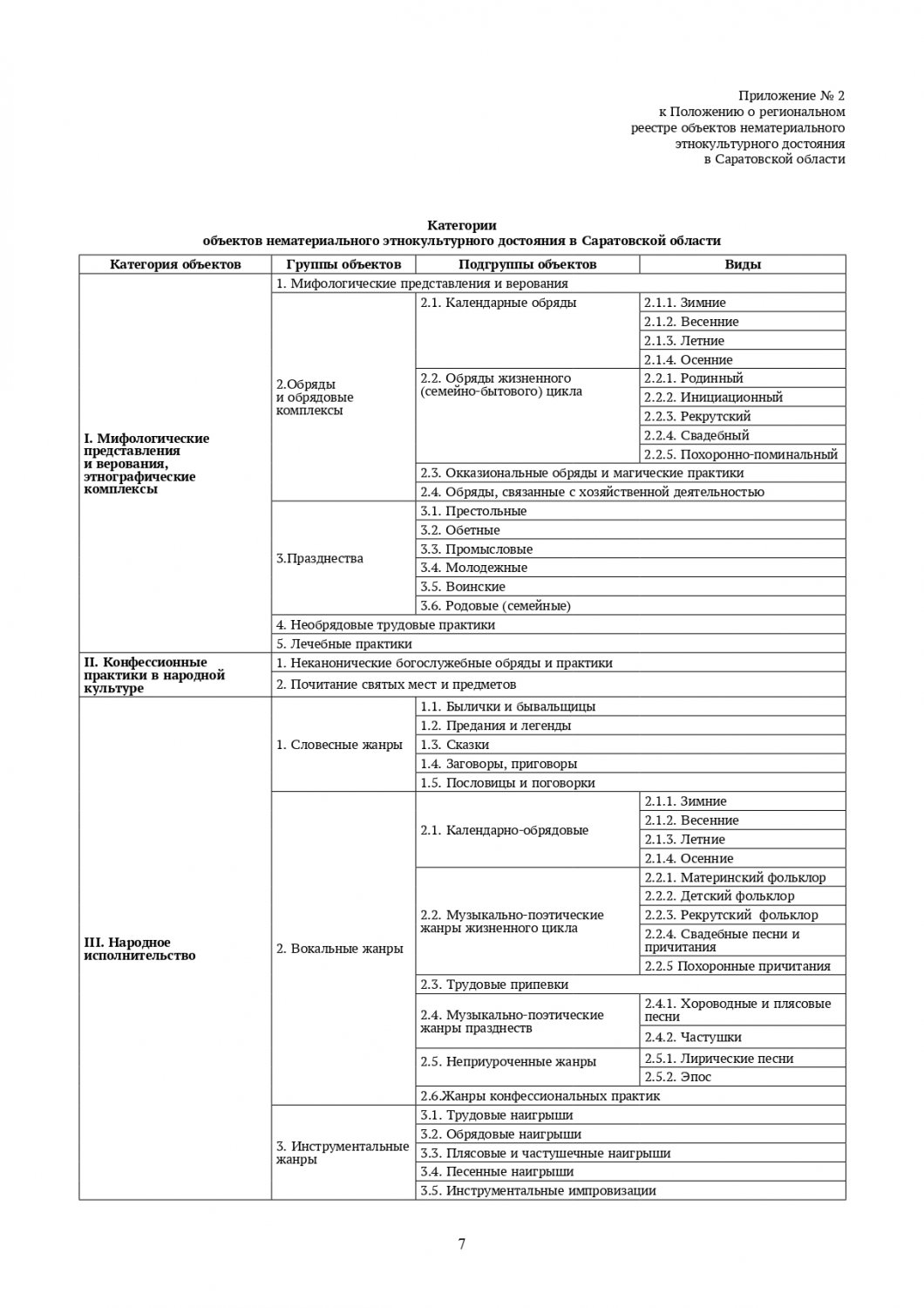 Все нематериальные объекты делятся на 20 групп. Но в Саратовской области многие группы не представлены. В частности, нет сведений об уникальных боевых искусствах, лечебных практиках, играх, неканонических богослужебных обрядов и практиках и т. д. Всего в Саратовской область сейчас насчитывается 14 объектов нематериального этнокультурного достояния, хотя еще в 2019 году их было не больше десятка. В него входят: