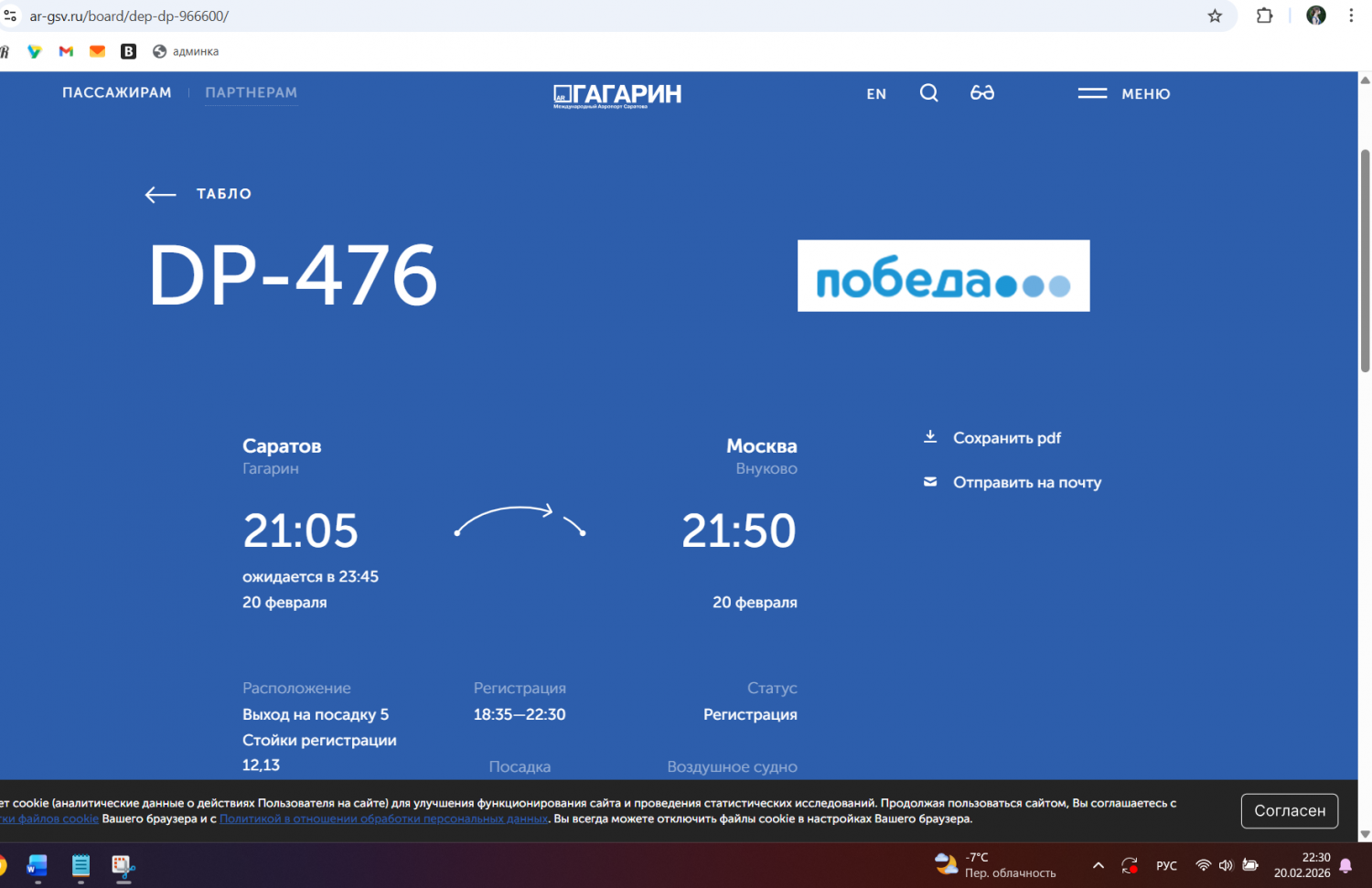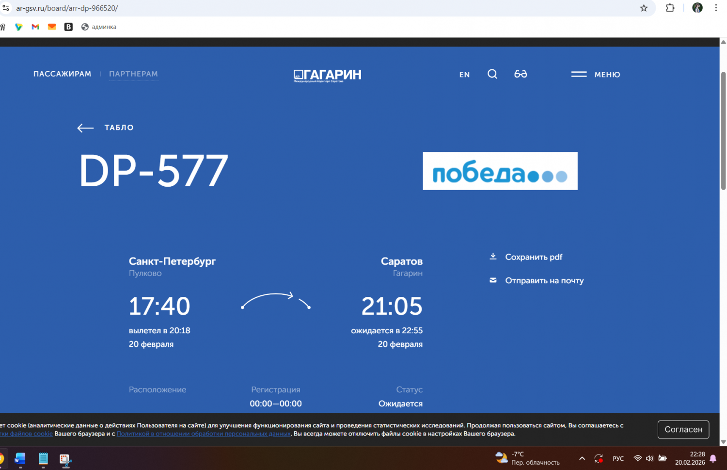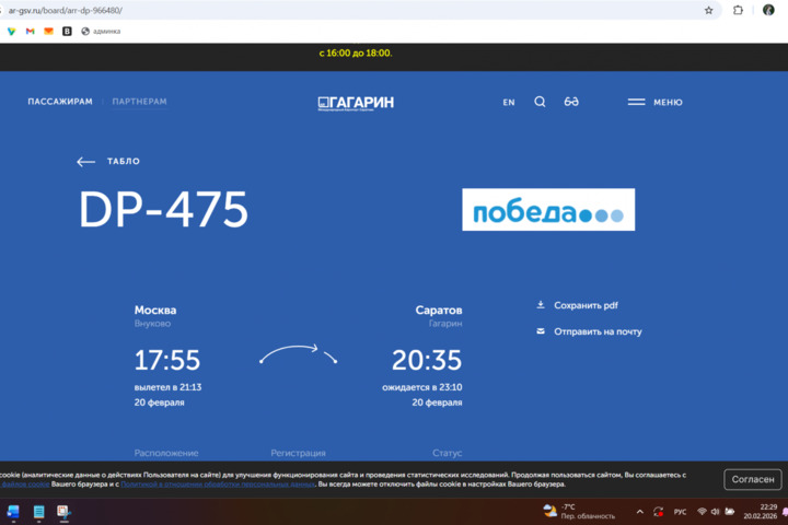 Согласно онлайн-табло саратовского «Гагарина», отмечаются задержки рейсов. Так, судно из Санкт-Петербурга вместо 21:05 теперь ждут в 22:55, из Москвы — вместо 20:35 в 23:10. Вылет одного рейса в Москву сдвинули с 18:20 на 22:15, другого — с 21:05 на 23:45. Самолёт в северную столицу вместо 21:35 улетит не ранее 23:55.