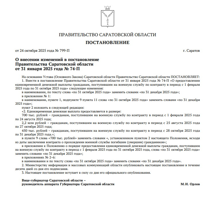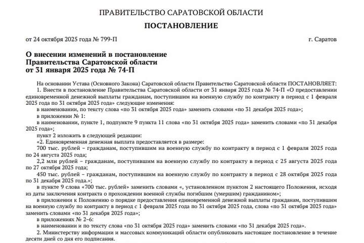 В документе поясняется, что с 1 февраля по 24 августа 2025 года в регионе действовала выплата в размере 700 тысяч рублей для граждан, поступивших на военную службу по контракту. Затем с 25 августа выплата была повышена до 2,2 миллиона рублей. Она действовала до 27 октября 2025 года.