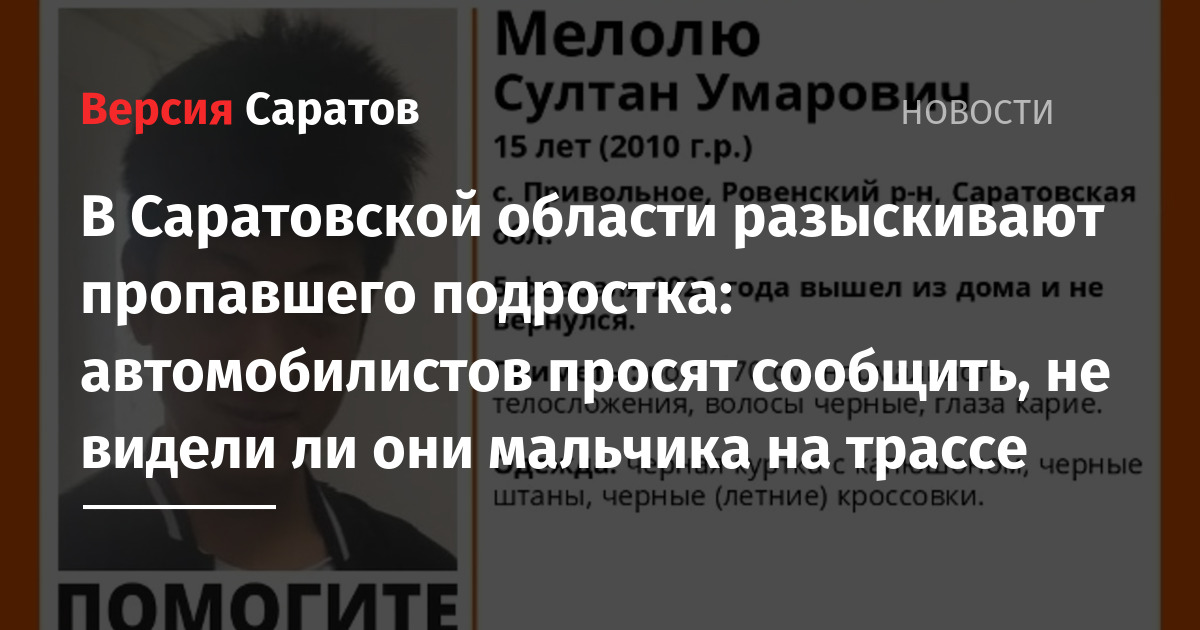 В Саратовской области разыскивают 15-летнего Султана Мелолю из села Привольное. Об этом сообщает поисковый отряд «Лиза Алерт». Как стало известно, 5 февраля подросток вышел из дома и не вернулся.