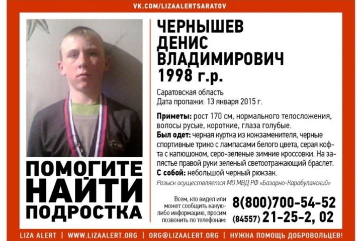 В Саратовской области уже больше недели разыскивают 17-летнего Дениса Чернышева. Молодой человек пропал 13 января. Как сообщает поисковая команда "Лиза Алерт", Денис был одет в черную куртку из кожзаменителя, черные спортивные трико с лампасами белого цвета, серую кофту с капюшоном, серо-зеленые зимние кроссовки. На запястье у него был светоотражающий браслет, а кроме того, сообщается, что с собой подросток захватил небольшой черный рюкзак. Розыск был инициирован Базарно-Карабулакским отделом МВД.