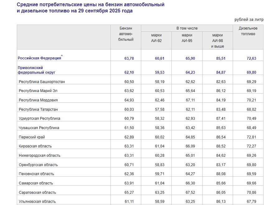 «За период с 23 по 29 сентября 2025 года изменение цен на бензин автомобильный было зафиксировано в 77 субъектах Российской Федерации, более всего в Севастополе +5,6% и Республике Крым +4,9%. В Москве и Санкт-Петербурге за прошедший период изменение цен на бензин автомобильный составило +0,3%», — сообщили в федеральной службе.