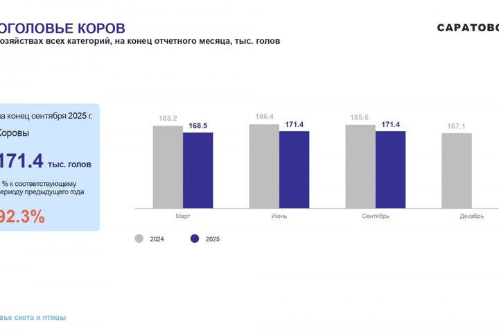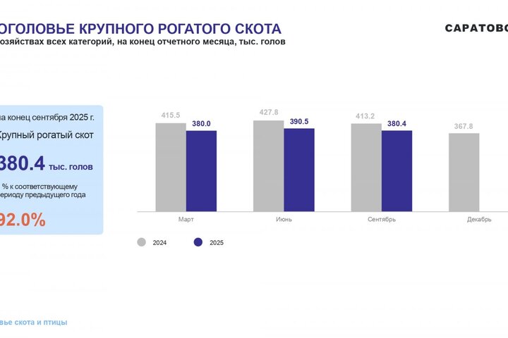 В Саратовской области за 9 месяцев 2025 года поголовье крупного рогатого скота сократилось на 8% до 380,4 тысячи голов. Об этом сообщает Саратовстат, опубликовавший данные о животноводстве по итогам третьего квартала.