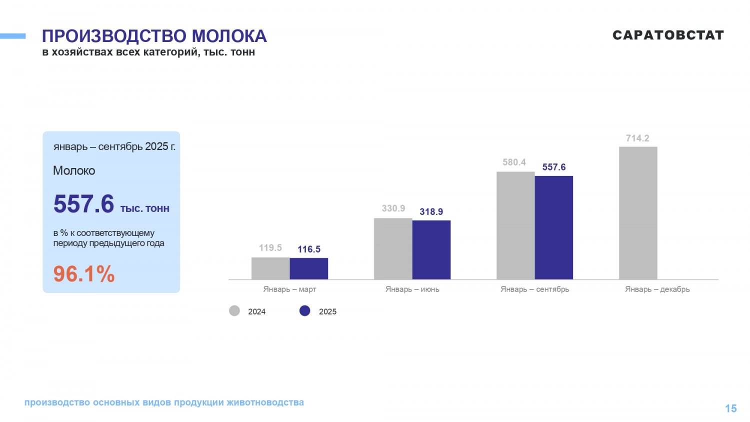 Производство скота и птицы на убой в живом весе выросло всего на 0,4% до 107,2 тысячи тонн, в том числе КРС — 41,7 тысячи тонн, свинины — 40,2 тысячи тонн. Производство молока сократилось на 3,9% до 557,6 тысячи тонн, а производство яиц выросло на 18,7% до 942,9 миллиона штук.