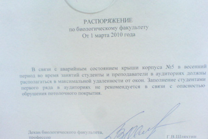 Все более изощренные меры принимаются руководителями различного уровня, чтобы спасти свой коллектив от опасности быть заваленными сосульками. В частности, сейчас на биологическом факультете СГУ действует распоряжение декана Геннадия Шляхтина, в котором говорится: «В связи с аварийным состоянием крыши корпуса №5 в весенний период во время занятий студенты и преподаватели в аудиториях должны располагаться в максимальной удаленности от окон. Заполнение студентами первого ряда в аудиториях не рекомендуется в связи с опасностью обрушения потолочного покрытия».