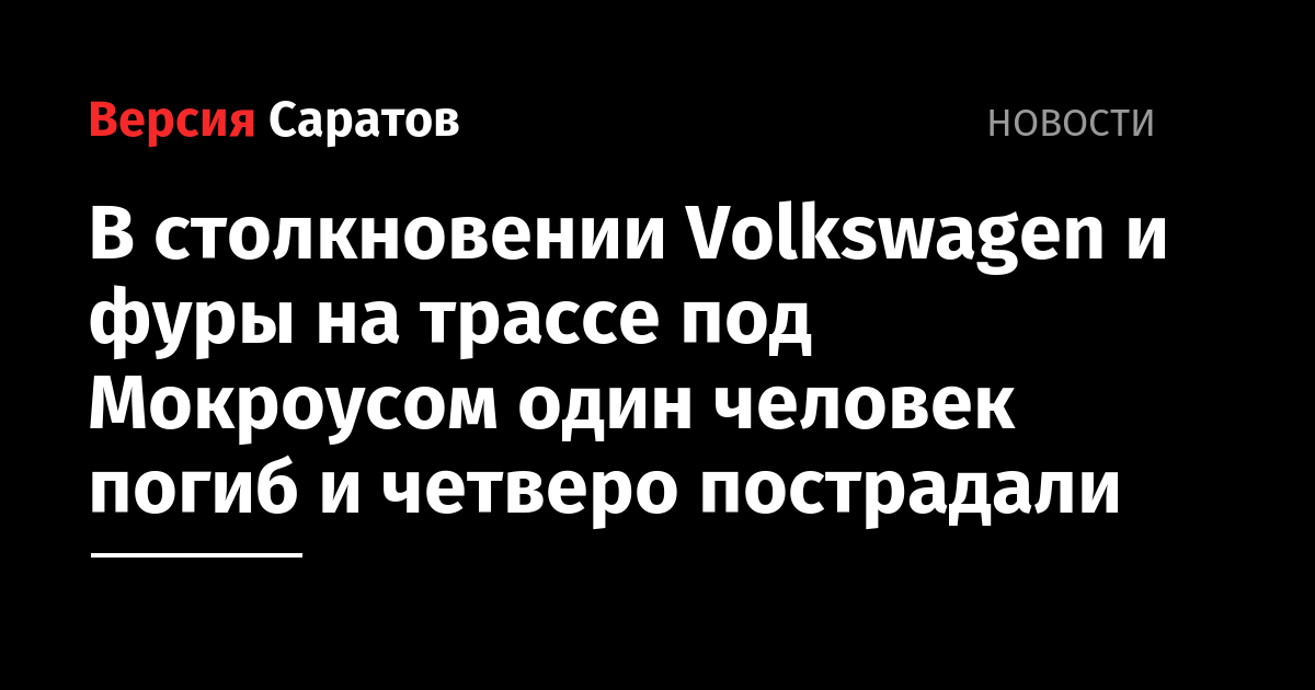 По данным УГИБДД по Саратовской области, 27-летний водитель Volkswagen Polo столкнулся с фурой DAF под управлением 33-летнего мужчины. В результате аварии водитель легковушки погиб на месте, а четверо его пассажиров были доставлены в больницу. Информация об их состоянии и характере травм уточняется. Сотрудники Госавтоинспекции разбираются в обстоятельствах аварии.