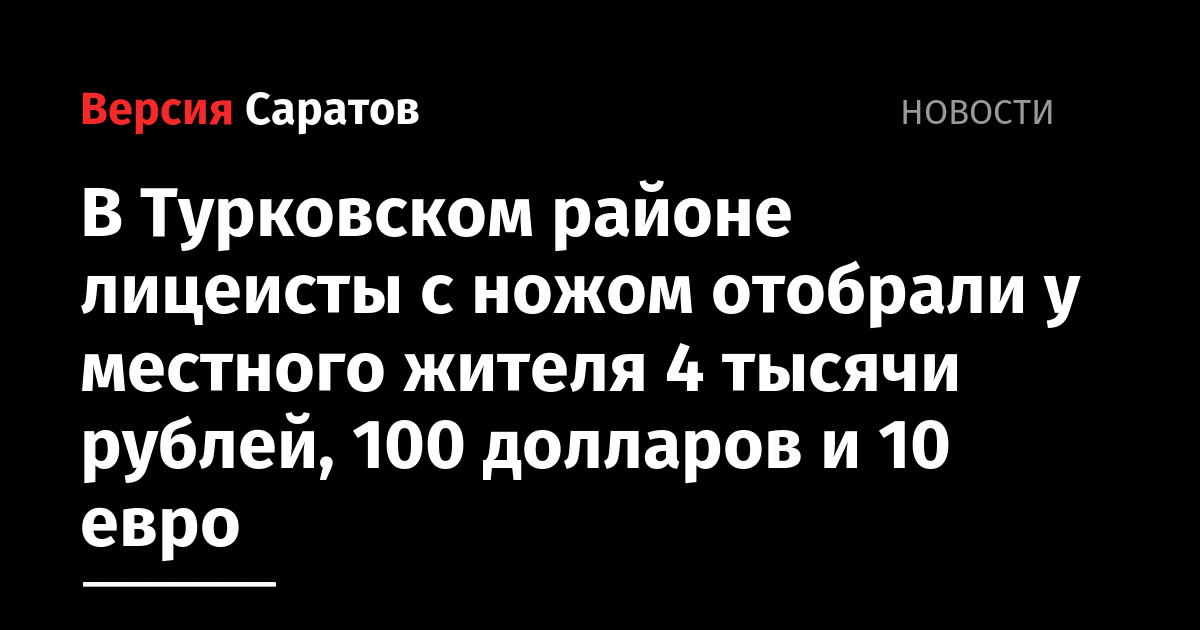 В Турковском районе лицеисты с ножом отобрали у местного жителя 4 тысячи рублей, 100 долларов и 10 евро
