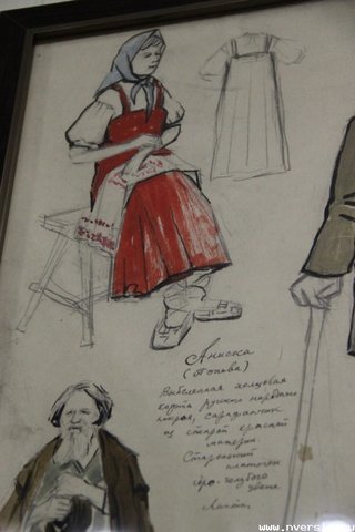 На третьем этаже ТЮЗа были представлены макеты известных спектаклей "Слуга двух господ", "Брак по-итальянски", "Стеклянный зверинец", "Софокл. Эдип. Тиран", "Мнимый больной" и других. На эскизах костюмов есть подписи художников, описывающие героев. По этим комментариям и создавались костюмы, рассказал Юрий Ошеров.