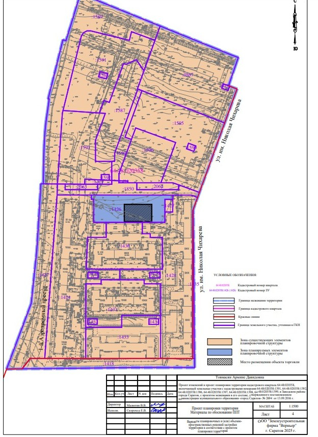 Проект сделало ООО «Землеустроительная фирма «Верньер» по договору с Армине Товмасян. Он предусматривает строительство на земельном участке с кадастровым номером 64:48:020358:1426. Это был пустырь, расположенный рядом с жилыми домами № 2 по 1-му Аэродромному проезду и № 10 и 10Б по улице Николая Чихарева. Участок площадью 3813 кв. м имеет вид разрешенного использования «размещение объектов капитального строительства, предназначенных для продажи товаров, торговая площадь которых составляет до 5000 кв. м».