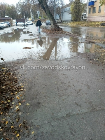 Автор поста поделился фото, на которых видно, что вместо тротуара на этом месте находится большая яма, которая в дождливую погоду напоминает лужу размером с озеро.