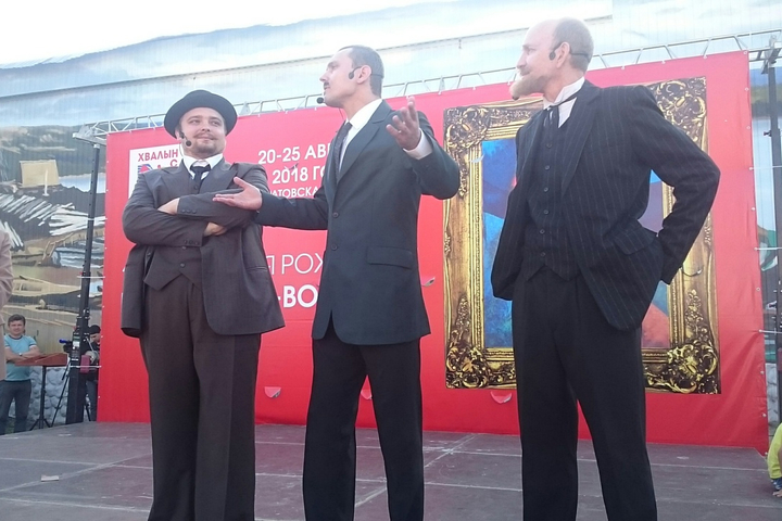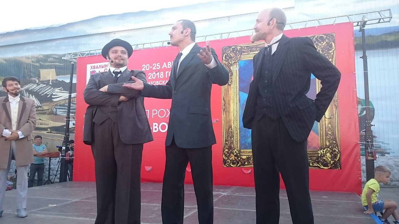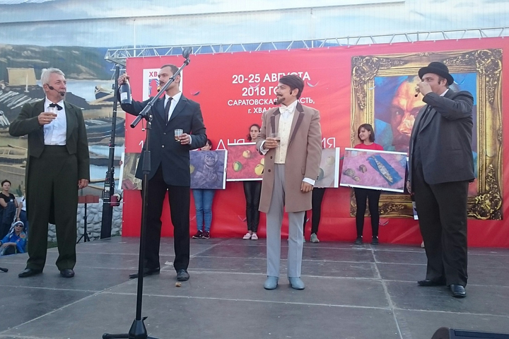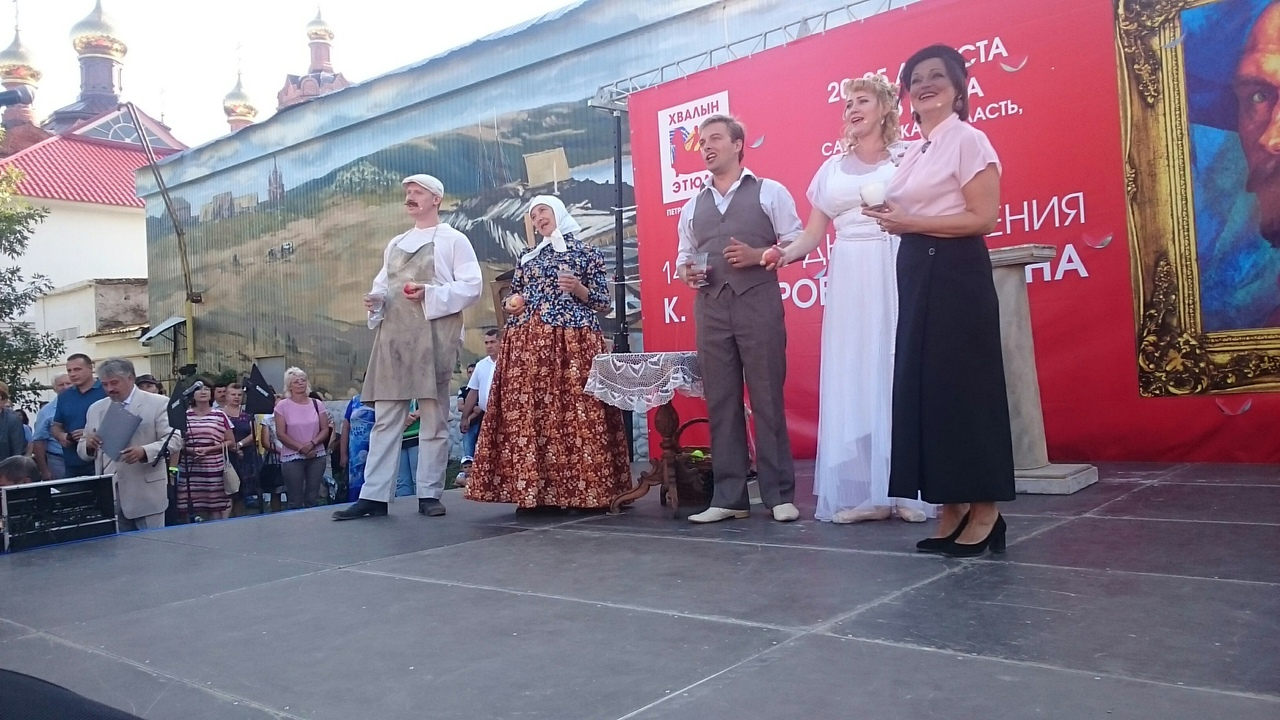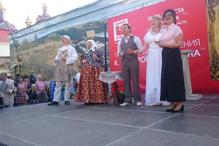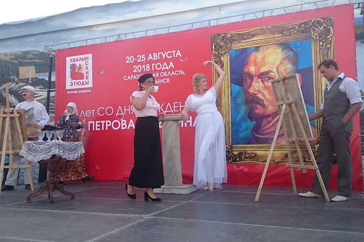 Возле картинной галереи совместно с гостями он посмотрел выступление актеров Вольского театра. Они показали отрывки из автобиографичной пьесы «Жертвенные», написанной самим Петровым-Водкиным. Среди действующих лиц постановки — известные саратовские художники — Павел Кузнецов, Петр Уткин, Виктор Борисов-Мусатов и сам Кузьма Петров-Водкин. В конце мини-спектакля актеры дружно подняли бокалы за саратовскую губернию.