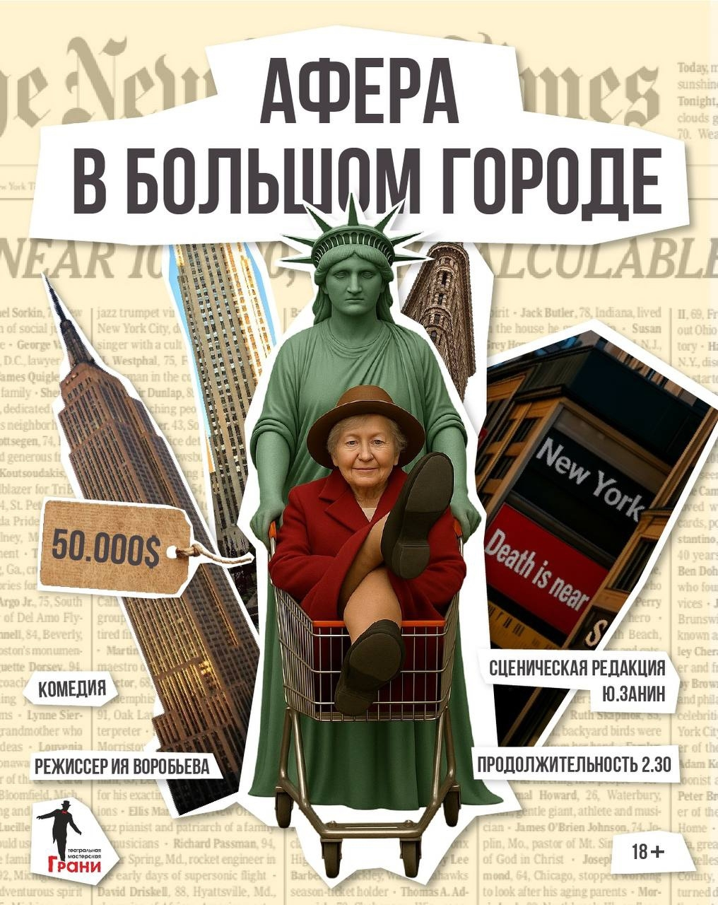 В предновогодние выходные в Театральной мастерской «Грани» в Саратове состоятся первые показы премьерного спектакля «Афера в большом городе» по мотивам пьесы Джона Патрика «Дорогая Памела» или «Как бы нам пришить старушку» (в сценической редакции актёра «Граней» Юрия Занина). Информация об этом размещена в соцсетях и на официальном сайте театра.