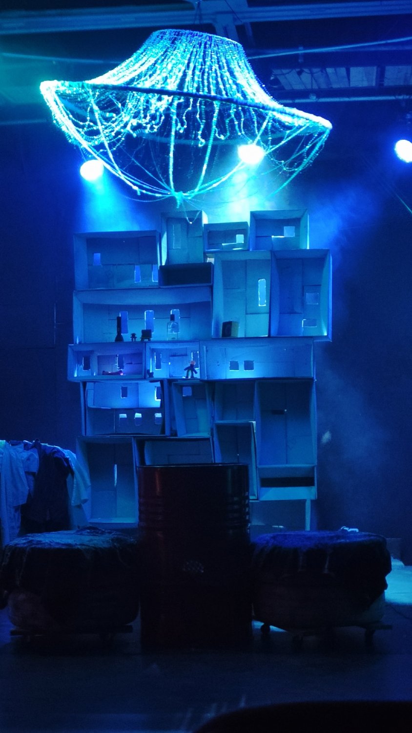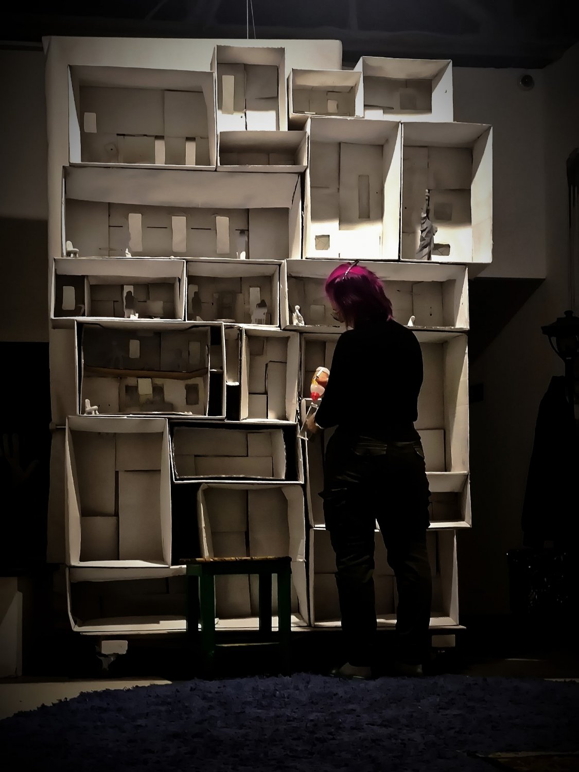 Мы делали интерьер каждой квартиры небольшого, коробочного города из многоэтажек. Это делал весь театр, ну и, понятное дело, актеры спектакля. Я специально заказывала человечков из пластика у нашего друга театра. Костюмы — часть шью я, часть обшивала Ксения (актриса в этом спектакле), часть мы заказывали у чудесной швеи Екатерины, которая регулярно и очень энергично шьет нашему театру.