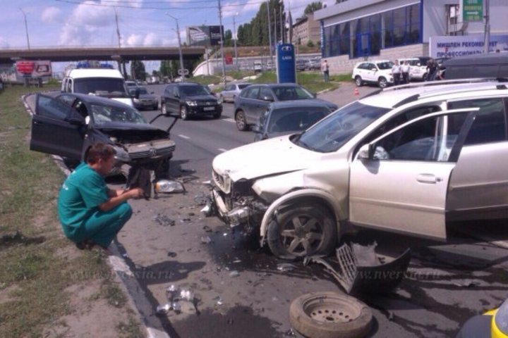 Сегодня днем на улице Шехурдина в районе студгородка столкнулись три иномарки. По словам очевидцев, у кроссовера Volvo XC90 на ходу возникли проблемы с колесом и машина выехала на встречную полосу, где столкнулась с Volkswagen Polo и Chevrolet Lanos.