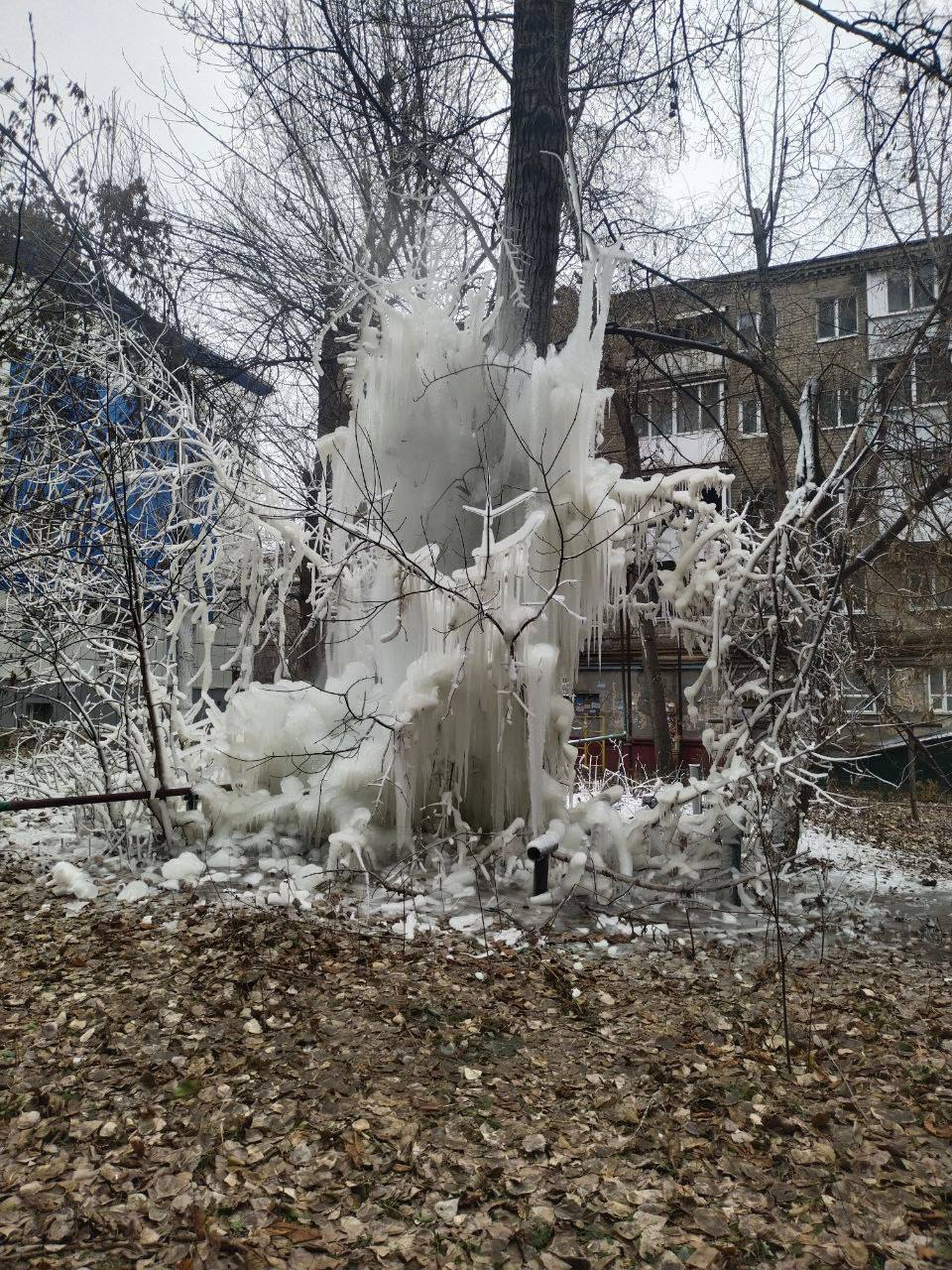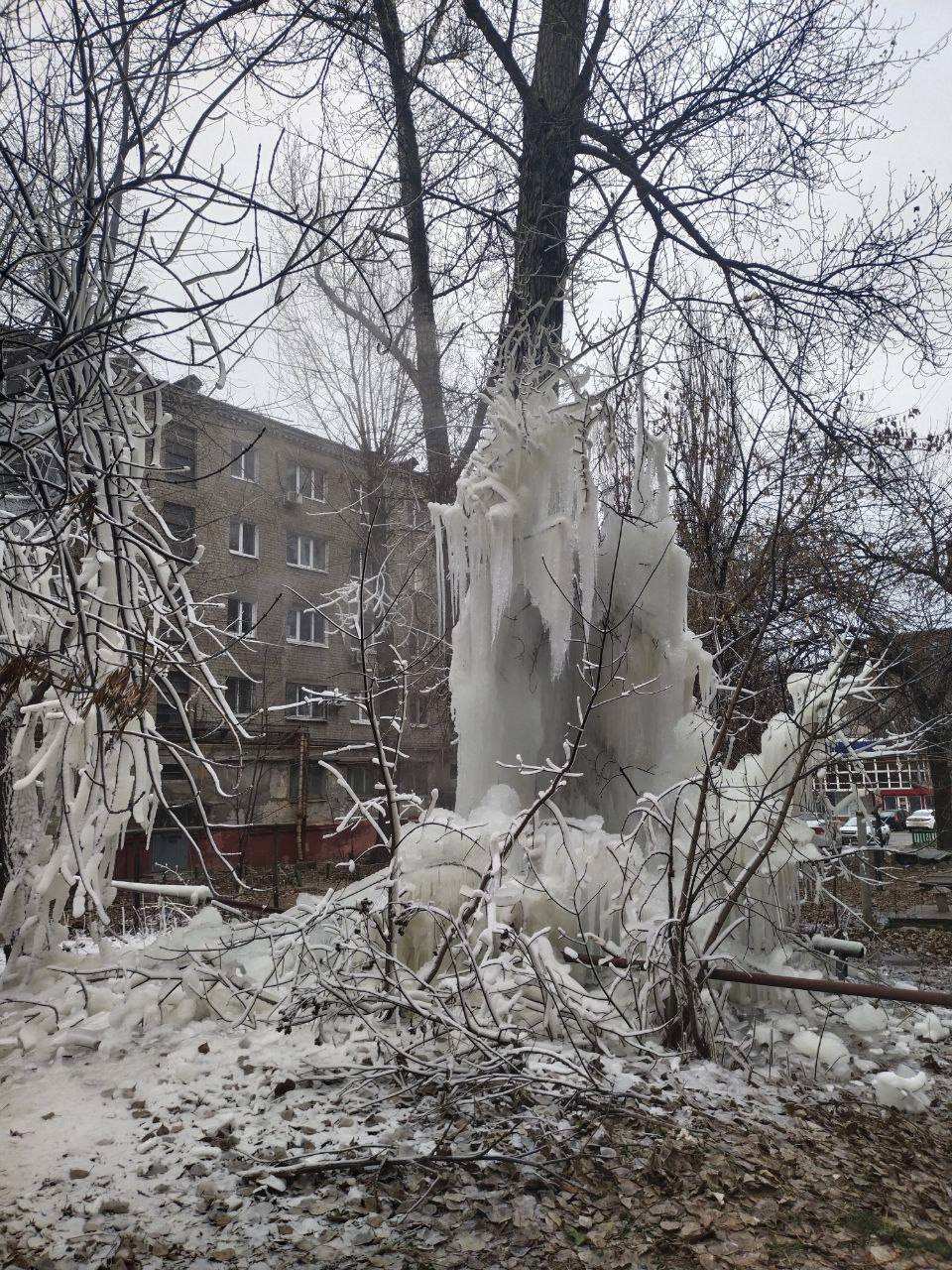Из-за течи во дворе дома № 3 на проспекте Строителей в Саратове образовались «ледяные скульптуры». Об этом рассказали очевидцы, их фото опубликовали в Telegram-канале «Saratov Detka». Судя по снимкам, образовавшиеся на деревьях глыбы — высотой в три этажа.
