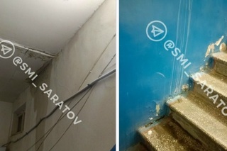 «Вероятно, аналогичная ситуация и в других подъездах. Мокрая стена, на полу образовалась лужа. В квартире на последнем этаже вода течёт с потолка и по стенам», — приводят в Telegram-канале слова саратовчанки.