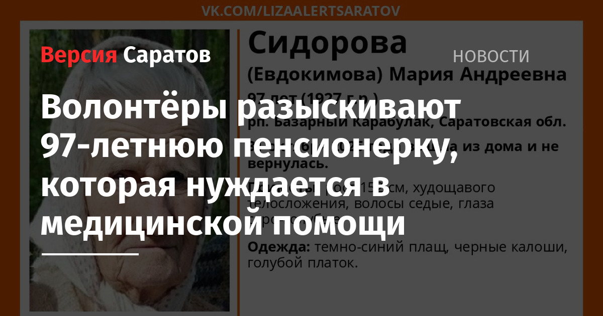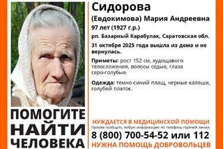 Волонтёры разыскивают пропавшую 97-летнюю Марию Сидорову (Евдокимову) из Базарного Карабулака. Как сообщили в поисковом отряде «„Лиза Алерт“ Саратовской области», с сегодняшнего дня, 31 октября, октября её местоположение неизвестно.