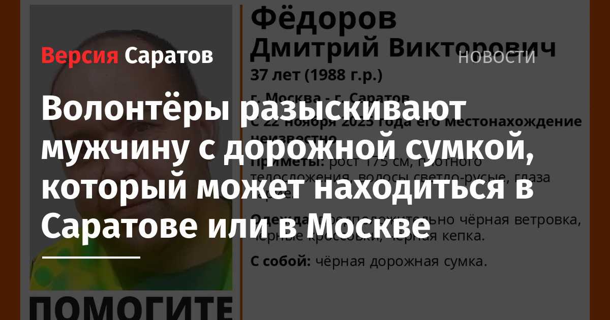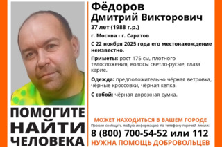 Волонтёры разыскивают пропавшего 37-летнего Дмитрия Фёдорова. Как сообщили в сообществе «Инфорг Лизаалерт», с 22 ноября его местоположение неизвестно. Мужчина может находиться в Москве или в Саратове.