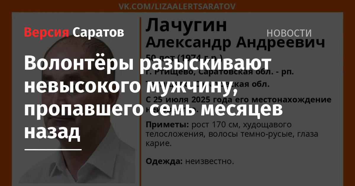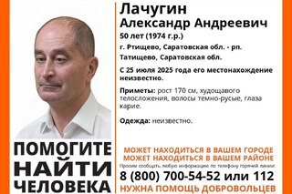 Волонтёры разыскивают пропавшего 50-летнего Александра Лачугина из Ртищево. Как сообщили в поисковом отряде «„Лиза Алерт“ Саратовской области», с 25 июля 2025 года его местоположение неизвестно.