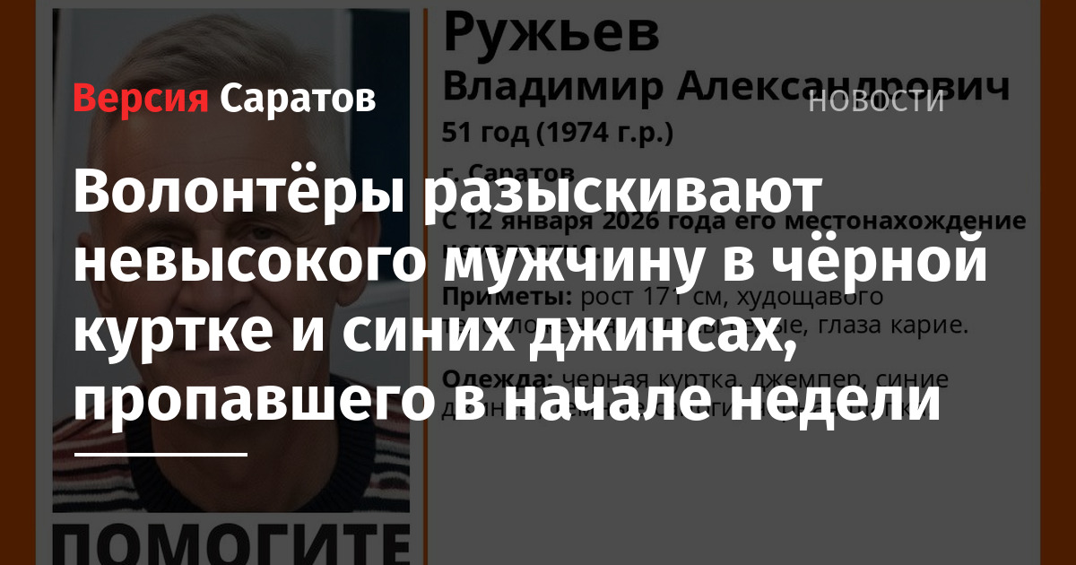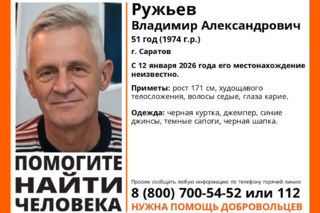 Волонтёры разыскивают пропавшего 51-летнего Владимира Ружьева из Саратова. Как сообщили в поисковом отряде «„Лиза Алерт“ Саратовской области», с 12 января его местоположение неизвестно.