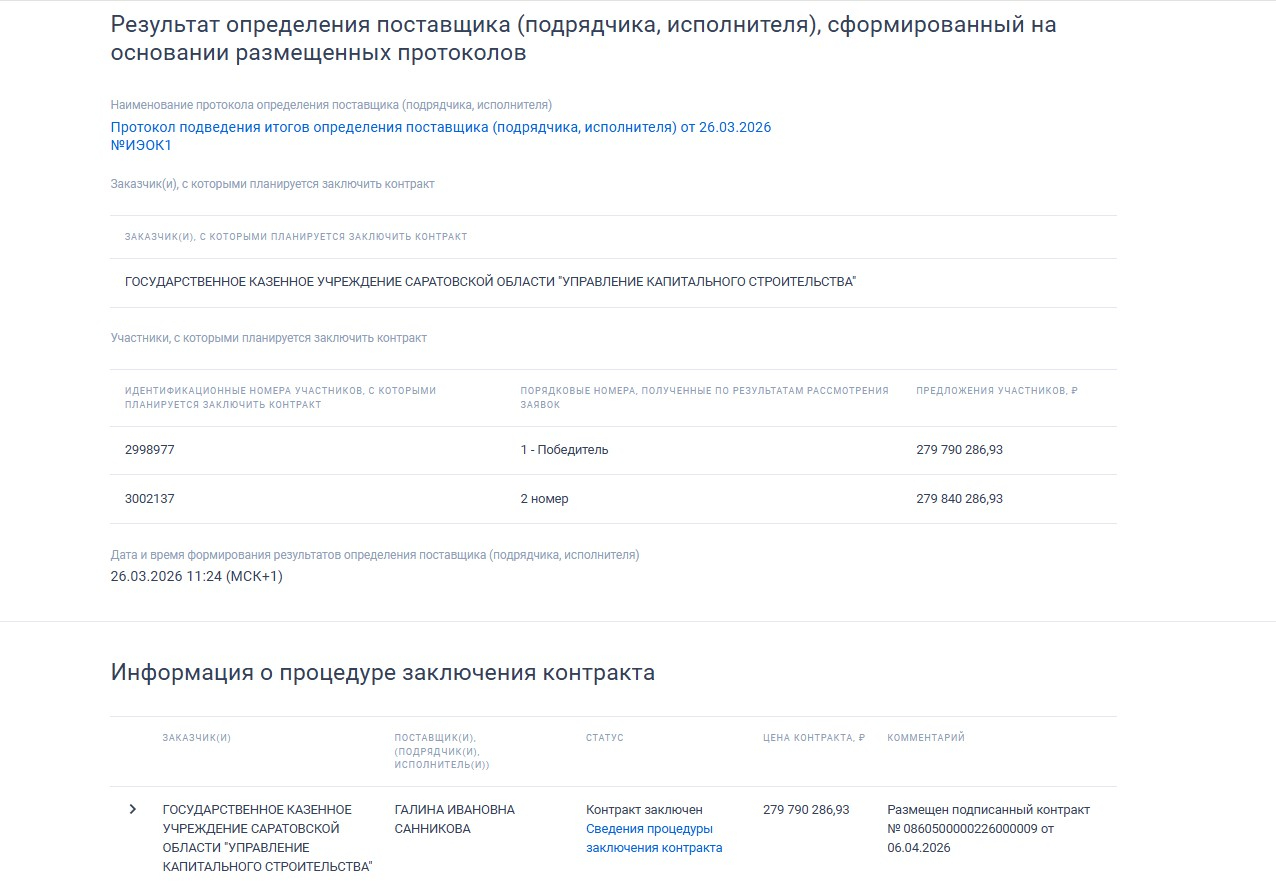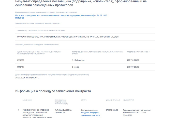 Победителем стала индивидуальный предприниматель Санникова Галина Ивановна. Она зарегистрирована в Москве и имеет опыт выполнения работ по реставрации объектов культурного наследия. В прошлом году она исполнила контракт на 344,5 миллиона рублей по сохранению с приспособлением под современное использование объекта культурного наследия федерального значения «Парк», входящего в состав памятника «Усадьба «Высокое» в Смоленской области. Цена была незначительно снижена в ходе торгов до 279,79 миллиона рублей.