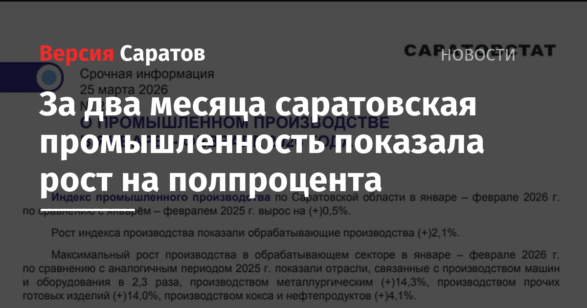 Индекс промышленного производства по Саратовской области в январе — феврале 2026 года по сравнению с аналогичным периодом года вырос на 0,5%. Рост индекса показали обрабатывающие производства, оказавшиеся в плюсе на 2,1%. О производстве электроэнергии и добыче полезных ископаемых официальная статистика умалчивает, насколько они просели — неизвестно.