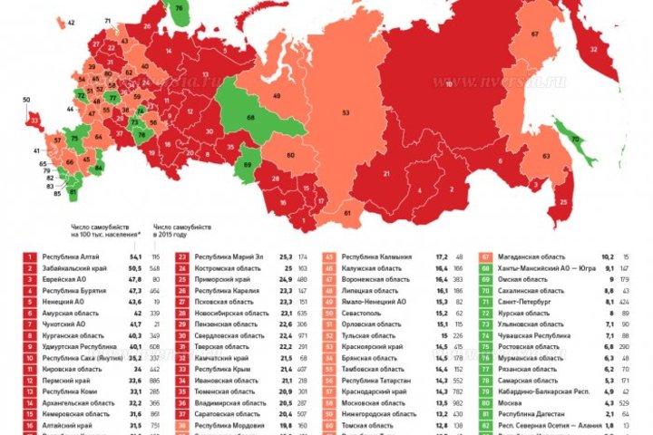На первом месте по процентному соотношению самоубийц к населению оказался Алтайский край: 54,1 на 100 тысяч человек. В количественном отношении больше всего суицидов в 2015 году произошло в Башкортостане — 1250. Самое низкое число самоубийств было зарегистрирована в Астраханской области (4 человека) и республиках Северного Кавказа: Дагестан — 64, Северная Осетия — 13, Ингушетия — 4, Чечня — 8.