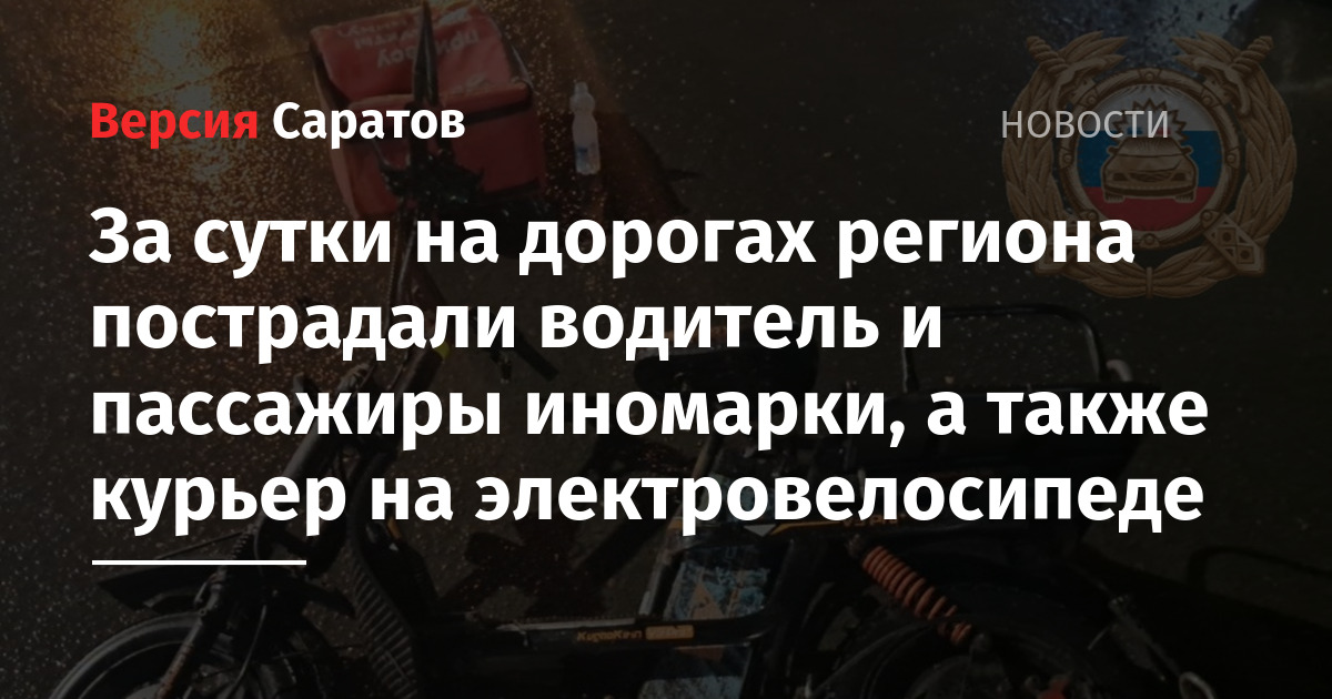 Другое ДТП произошло в Саратове. В 19:30 у дома № 5 на Разина столкнулись ТАГАЗ Вортекс под управлением 44-летнего мужчины и 24-летний электровелосипедист. Последнего госпитализировали. Судя по опубликованному УГИБДД фото, пострадал курьер.