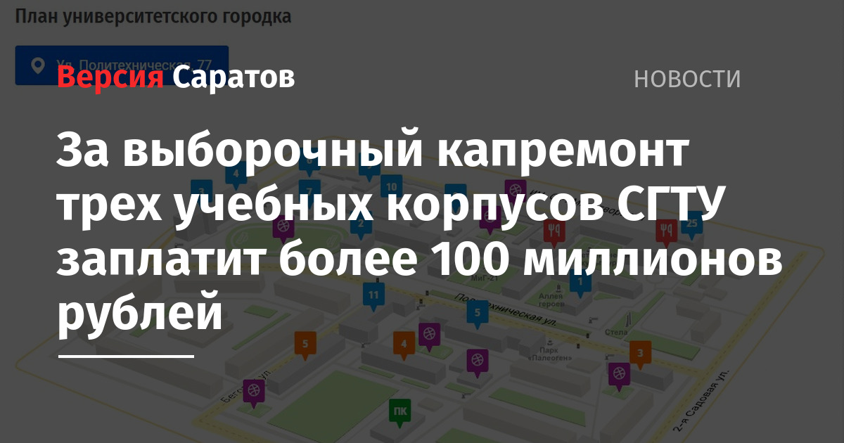 В Саратове до конца года планируется выполнить выборочный капитальный ремонт учебных корпусов № 3, 4, 6 СГТУ имени Гагарина Ю. А. Все корпуса расположены на исторический территории вуза по адресу: улица Политехническая, 77.