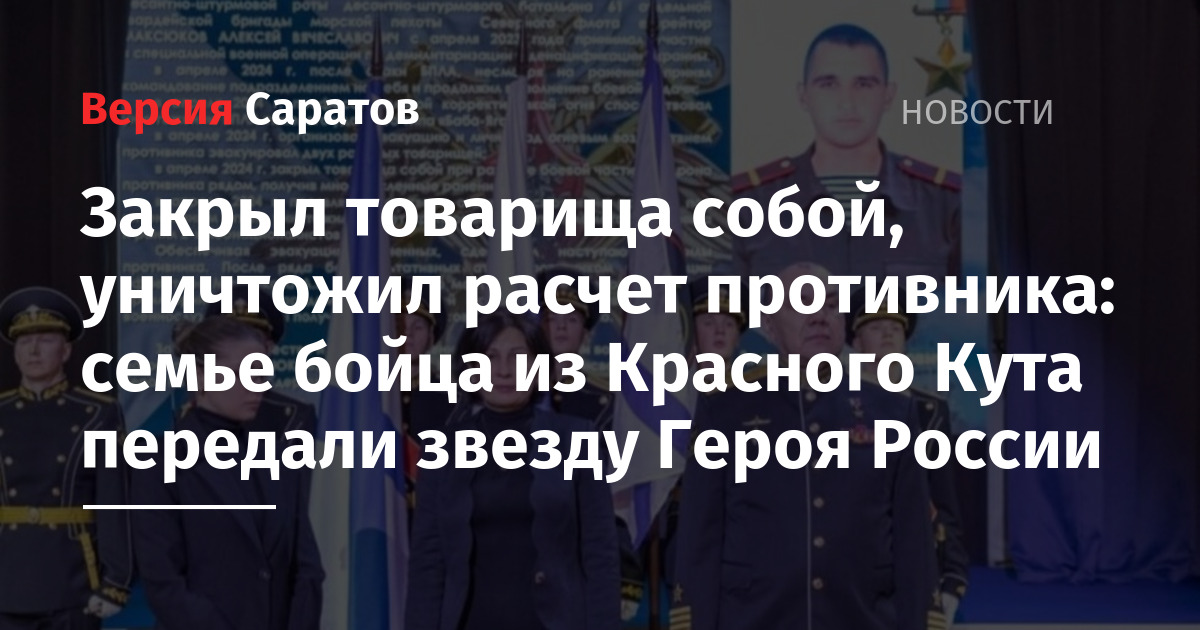Маме Ольге и сестре погибшего Елене звезду Героя вручал командующий ВМС РФ Герой России Александр Моисеев. В зале находился командир Алексея и один из тех, чей отход он прикрывал», — говорится в Telegram-канале «Твои Герои, Саратов».