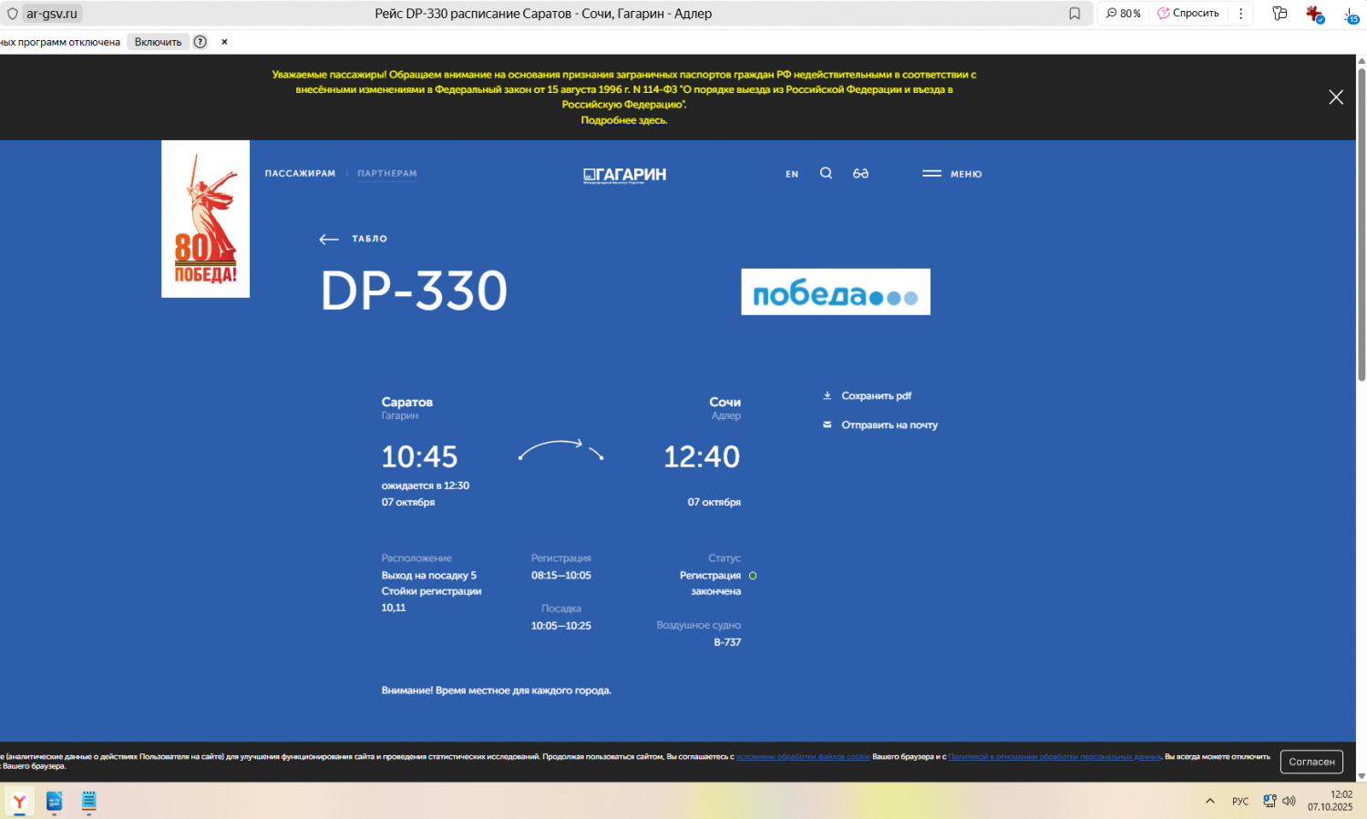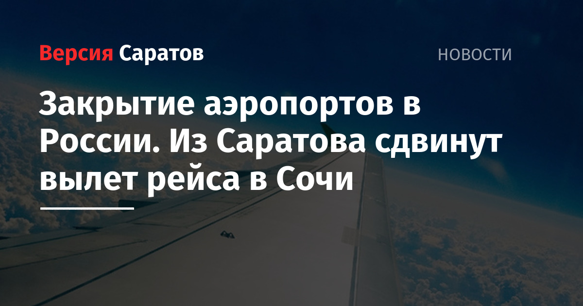 Ранее представитель Росавиации Артём Кореняко сообщал о закрытии аэропорта в Сочи. Буквально недавно его открыли. Самолёт из Саратова в Сочи должен был вылететь в 10:45. Сначала время вылета сдвинули на час, теперь — на 12:30.