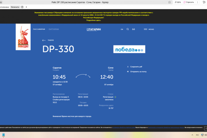 В саратовском аэропорту «Гагарин» задерживается вылет самолёта в Сочи. Это видно на онлайн-табло воздушной гавани.