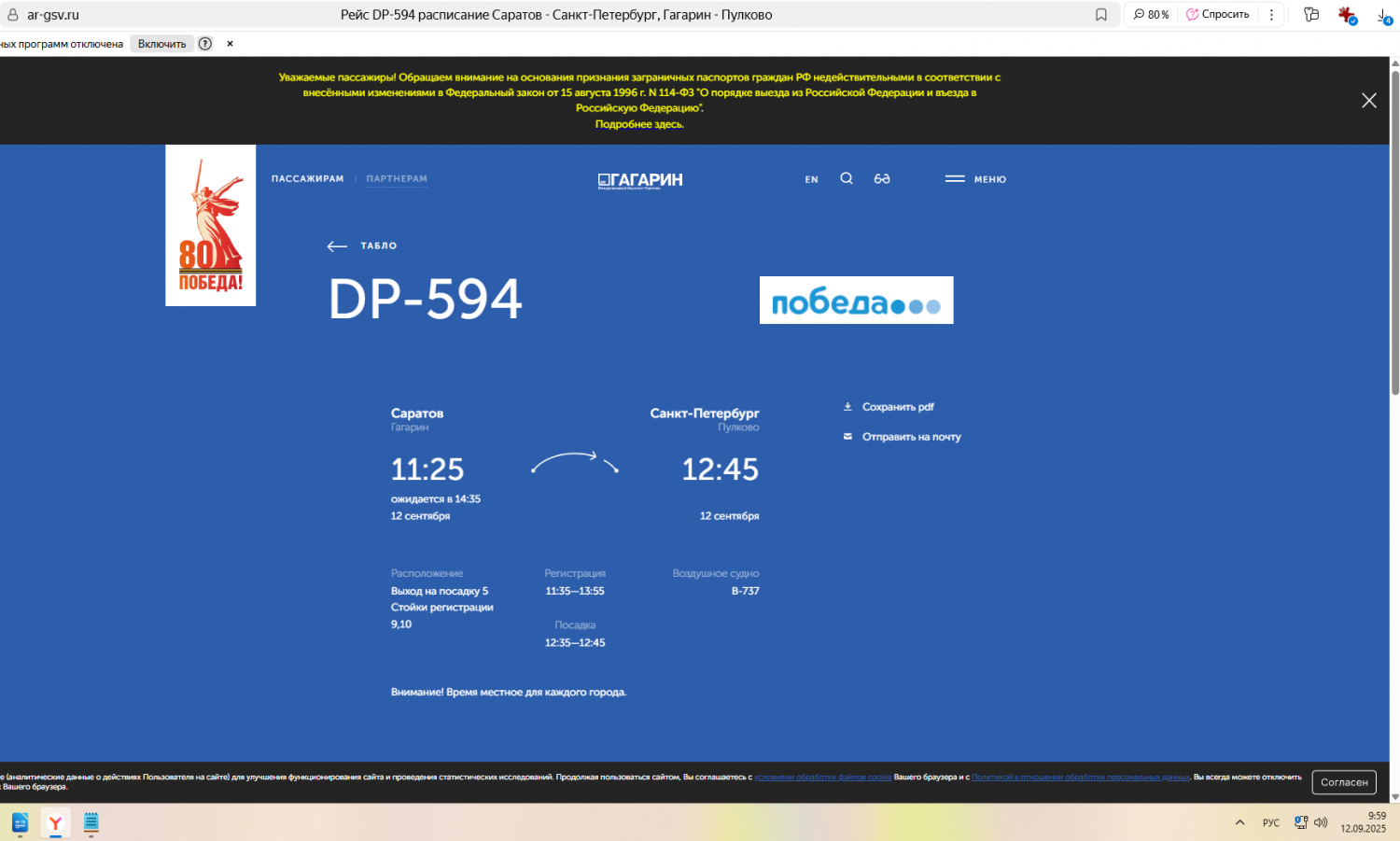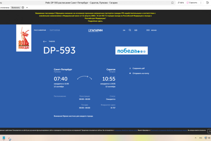 Так, вылет из Саратова в северную столицу, запланированный на 11:25, перенесли на 14:35. Также перенесено время прибытия самолёта из Санкт-Петербурга. С 7:40 вылет оттуда пока что перенесли на 11:00.