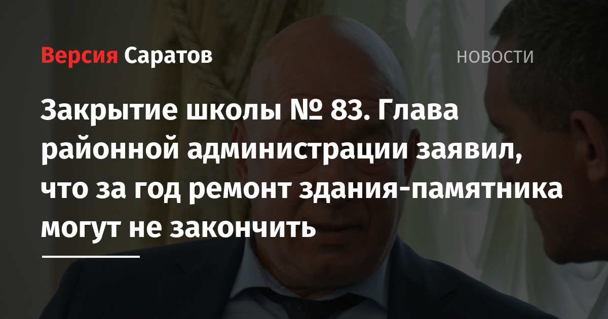 Ремонт школы № 83 в Заводском районе Саратова, которую закрыли месяц назад, накануне нового учебного года, может растянуться более, чем на год. Об этом сообщил с беседе с корреспондентом ИА «Версия-Саратов» глава администрации Заводского района Вячеслав Доронин. Вчера чиновник отчитывался о работе за первое полугодие перед депутатами, однако они не стали задавать вопрос о судьбе 83-й школы.