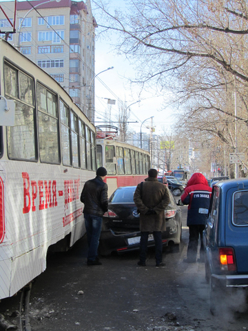 В настоящий момент затруднено движение на пересечении улицы Советской и Мирного переулка. Трамвай столкнулся с иномаркой. Некоторые автомобилисты предпринимают попытки объехать пробку через Мирный переулок под запрещающий знак.